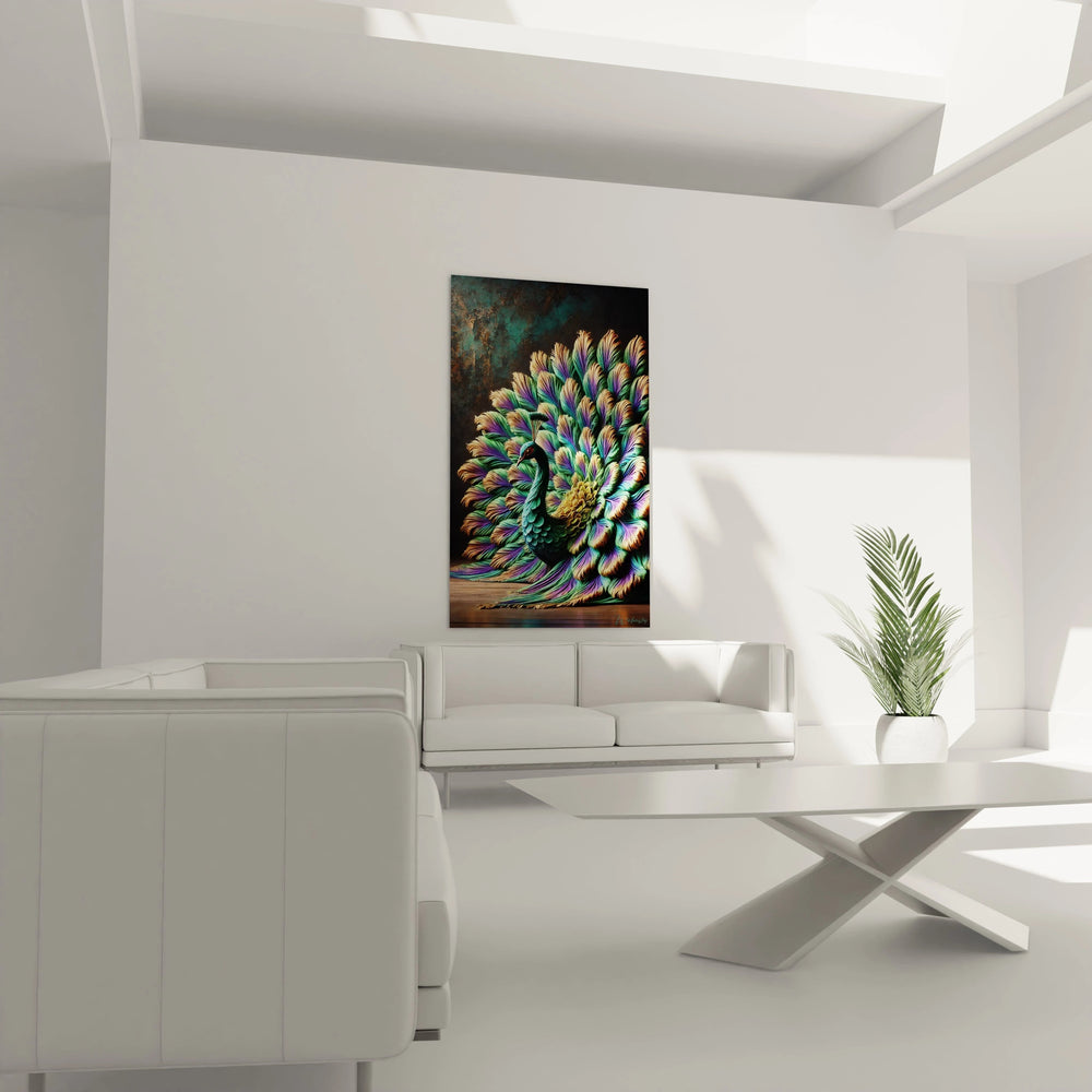 Cette création puise dans la symbolique ancestrale du paon, cet oiseau sacré dans plusieurs cultures pour sa représentation de l’amour, de la beauté et de la renaissance. L’alliance entre une inspiration baroque et une touche moderne confère à cette œuvre une aura intemporelle et universelle, idéale pour enrichir votre collection d’art décoratif.