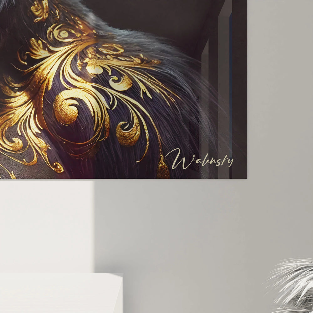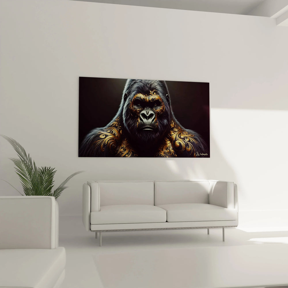 Ce tableau incarne la dualité fascinante du roi des primates : une force brute associée à une sensibilité profonde. Le regard intense du gorille vous transporte dans son univers, révélant un monde fait de sagesse ancestrale et de dignité royale. Les motifs dorés inspirés du style baroque ne sont pas de simples décorations, mais des symboles qui portent l’aura sacrée de cet animal noble.