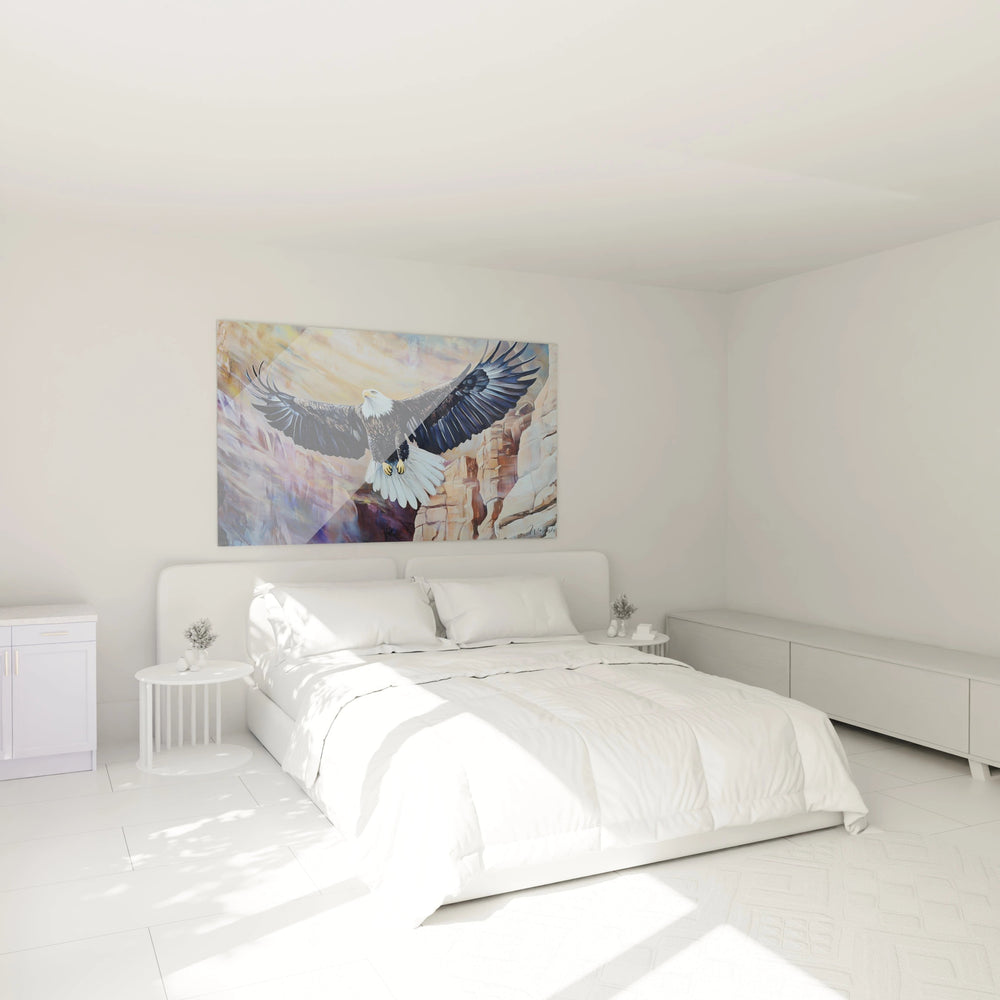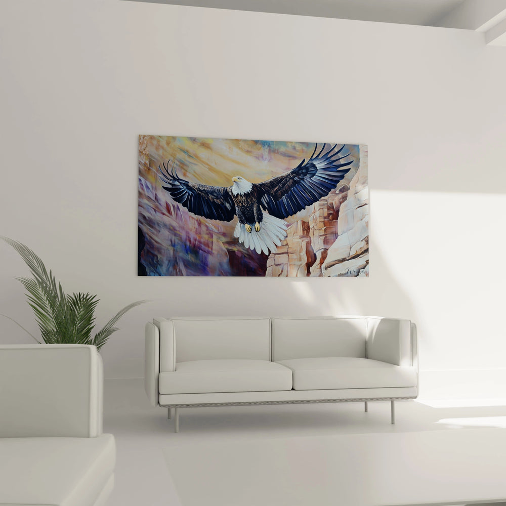 Ce tableau aigle présente une œuvre d'art saisissante mettant en scène un aigle à tête blanche aux ailes majestueusement déployées. L'oiseau de proie domine la composition avec une envergure impressionnante qui occupe la quasi-totalité de l'espace visuel. Le tableau aigle canyon rocheux révèle immédiatement sa force symbolique à travers la posture de l'animal en plein vol, ses serres dorées parfaitement visibles et son regard perçant dirigé vers l'observateur. L'arrière-plan rocheux aux tons chauds crée un contraste naturel avec le plumage sombre de l'aigle, donnant à l'ensemble une atmosphère de grandeur sauvage et de liberté absolue qui éveille instantanément un sentiment de respect et d'admiration.