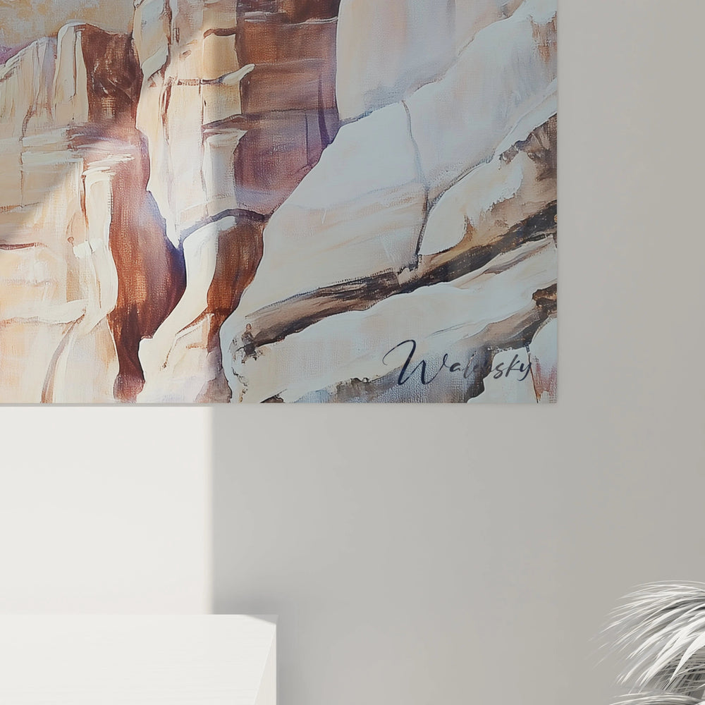 L'expérience visuelle de ce tableau aigle grand format varie considérablement selon la distance d'observation. À distance, l'œuvre révèle immédiatement sa composition majestueuse et son impact émotionnel global, l'aigle apparaissant comme un symbole puissant de liberté sur fond de paysage grandiose. L'examen rapproché dévoile une richesse de détails extraordinaire : la texture individuelle de chaque plume, les reflets subtils dans l'œil de l'oiseau, les nuances de couleur dans le bec et les variations tonales du plumage. Cette décoration murale aigle canyon américain révèle également des détails architecturaux rocheux qui enrichissent la lecture de l'œuvre. L'effet global maintient sa force d'attraction même à très grande distance, témoignant d'une composition solide et d'un choix chromatique judicieux qui assure une lisibilité parfaite dans tous les contextes d'observation.