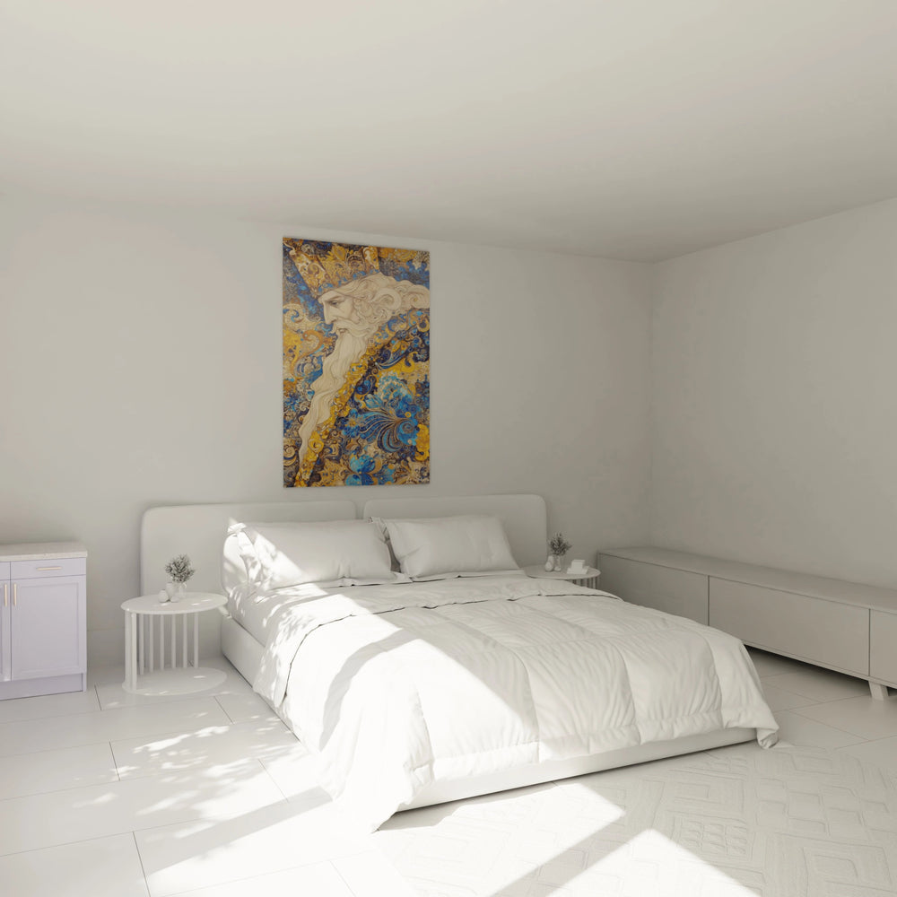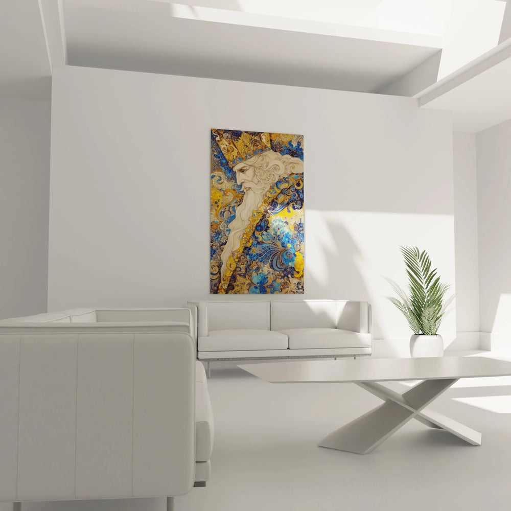 L'impact émotionnel de cette décoration murale roi majestueux provient de l'équilibre parfait entre la chaleur des ors et la profondeur des bleus, évoquant à la fois la royauté terrestre et la spiritualité céleste.