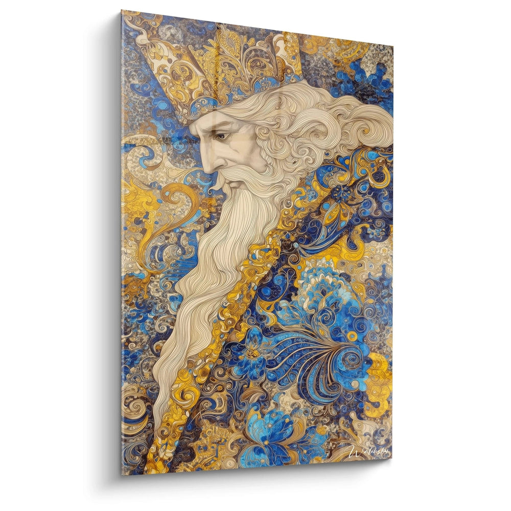 Ce tableau roi présente un portrait saisissant d'un souverain à la barbe blanche majestueuse, orné d'une couronne dorée aux détails complexes. L'œuvre révèle immédiatement la noblesse du personnage central à travers son regard contemplatif et sa posture digne. Les tableau roi ornements dorés qui composent sa couronne attirent l'attention par leurs motifs byzantins sophistiqués. La composition baroque de ce tableau roi style artistique se distingue par ses courbes fluides et ses spirales hypnotiques qui environnent le visage du monarque. Chaque élément décoratif témoigne d'un savoir-faire exceptionnel, créant une harmonie visuelle remarquable entre le portrait central et les ornementations périphériques.
