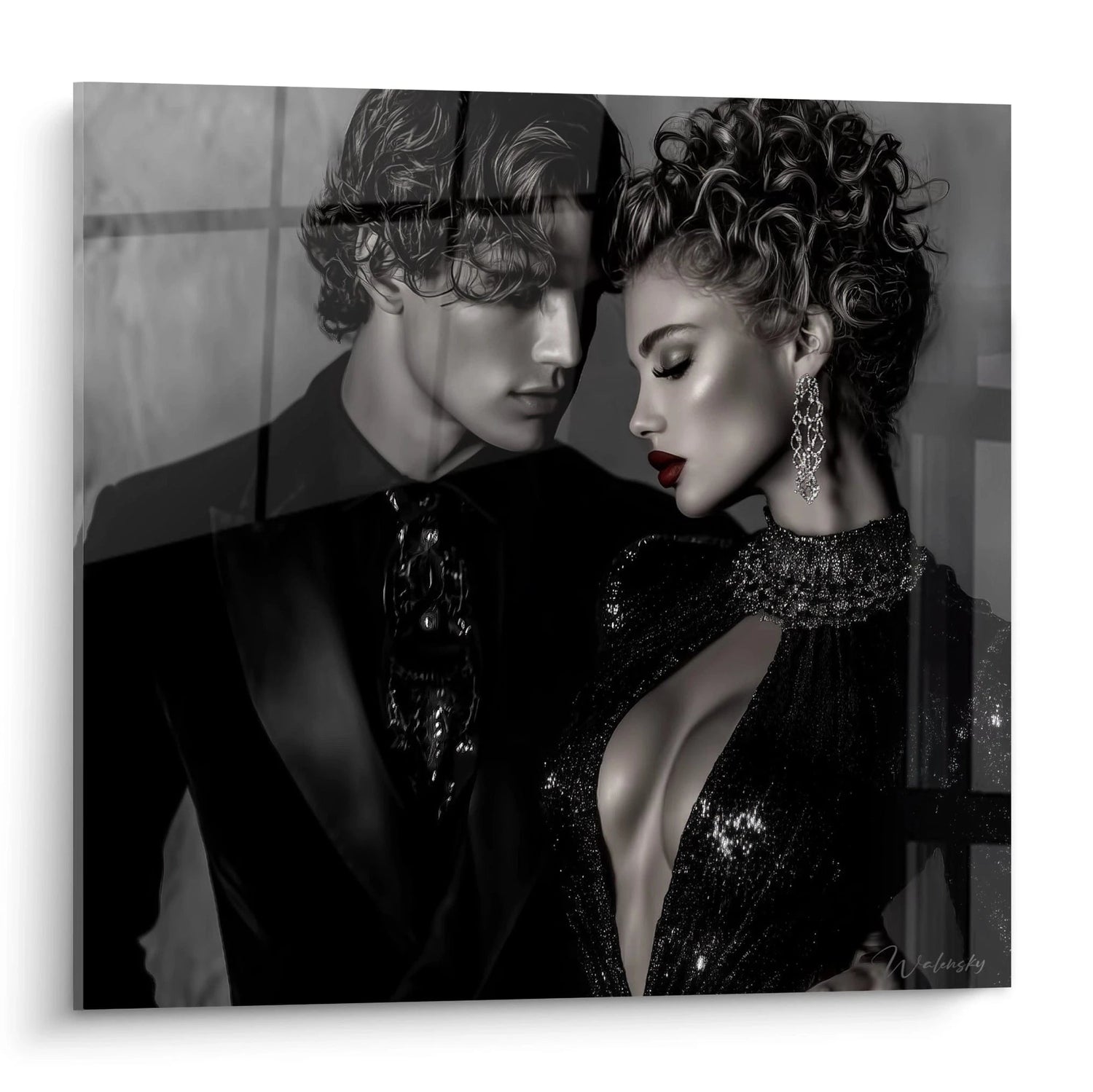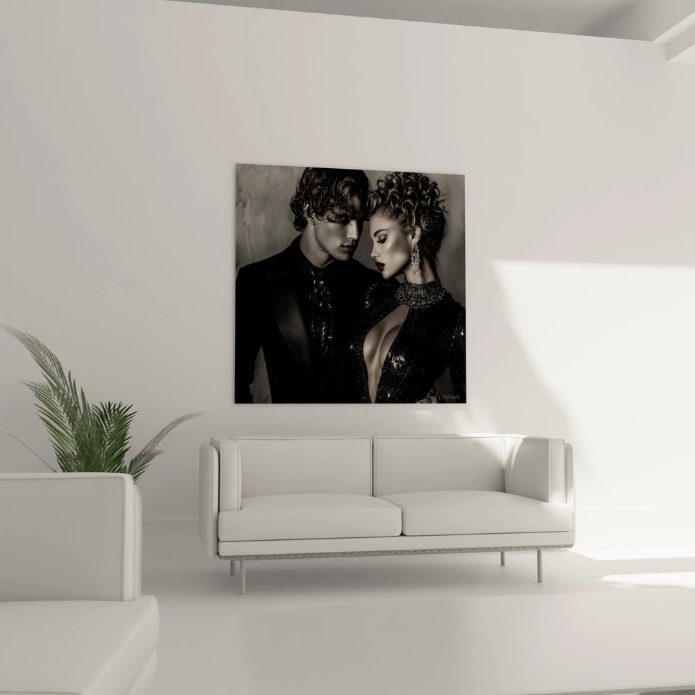 La symbolique de cette œuvre repose sur la dualité entre masculin et féminin, exprimée à travers un contraste visuel saisissant. Le noir et blanc dominant symbolise l'intemporalité et l'élégance classique, tandis que la seule touche de rouge des lèvres féminines représente la passion, la vie et la sensualité. Cette palette chromatique épurée tableau amplifie l'impact émotionnel de l'image en concentrant l'attention sur les expressions et les détails. Les nuances de gris créent une profondeur sculpturale qui transforme les visages en véritables études de clair-obscur, technique chère aux maîtres de la peinture classique.