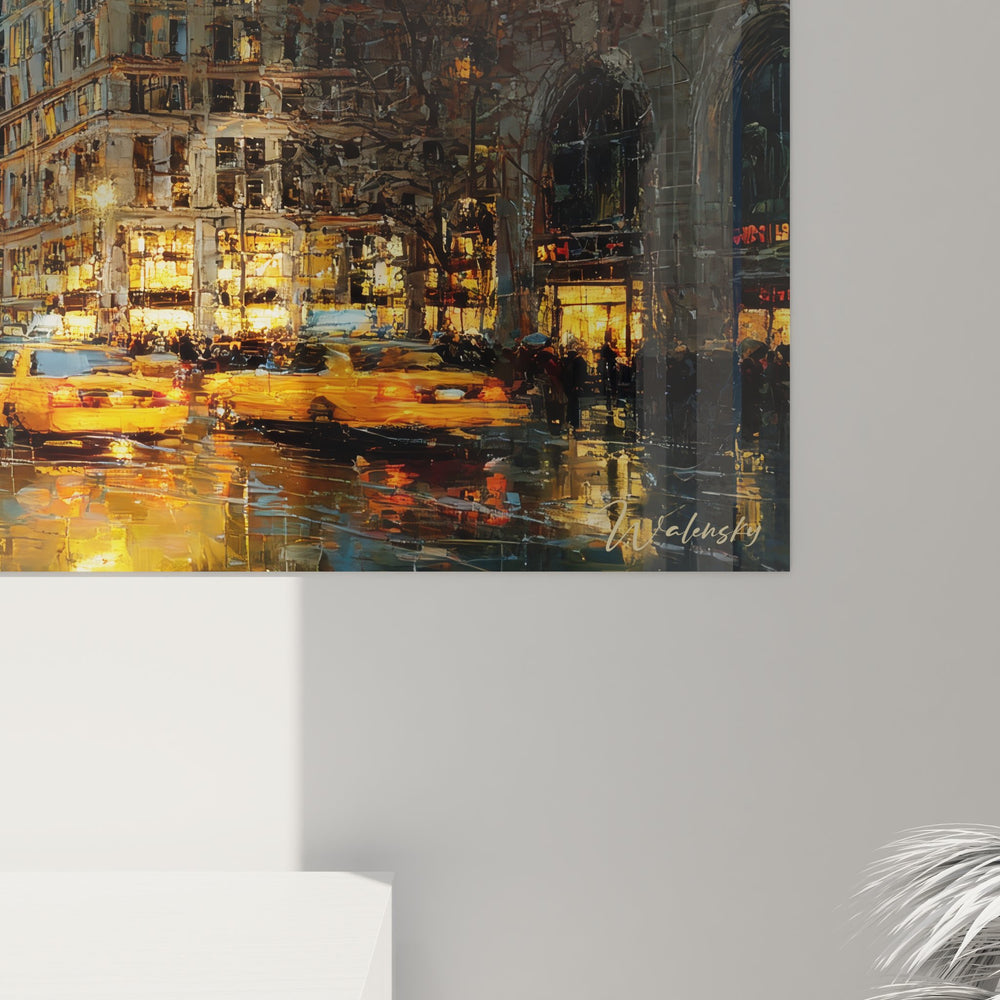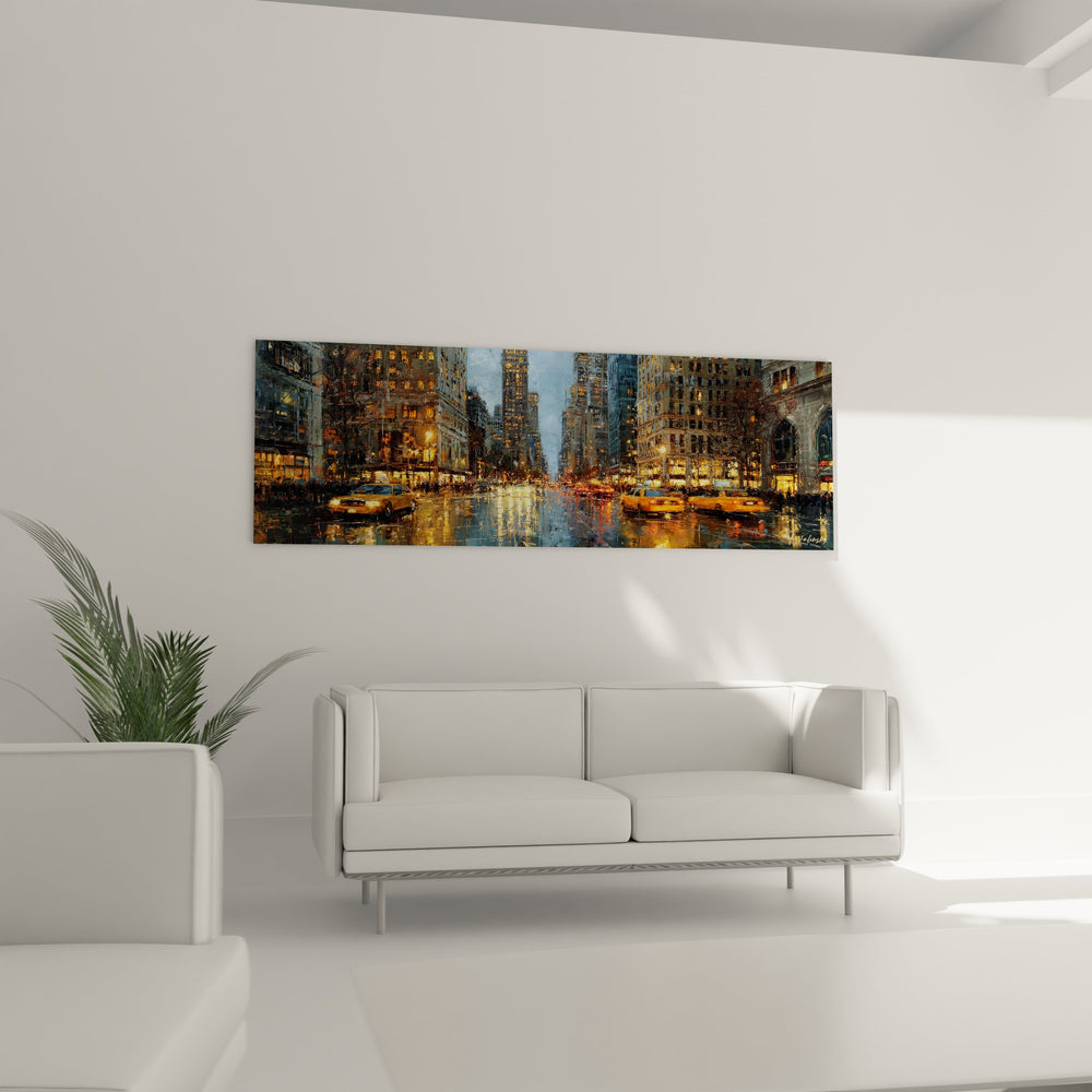 Ce tableau mural Manhattan capture avec une intensité saisissante l'atmosphère unique d'une rue de New York sous la pluie à la tombée de la nuit. L'œuvre dépeint une avenue emblématique de Manhattan où les gratte-ciel illuminés se dressent majestueusement de chaque côté, créant un canyon urbain typique de la métropole américaine. Les taxis jaunes iconiques ponctuent la scène, leurs silhouettes dorées se reflétant sur l'asphalte mouillé dans un jeu de miroirs fascinant. Cette peinture urbaine contemporaine révèle toute la poésie de la ville qui ne dort jamais, où chaque fenêtre éclairée raconte une histoire différente. Les reflets lumineux sur chaussée humide transforment la rue en une véritable palette de couleurs chaudes et froides qui s'entremêlent harmonieusement. L'artiste a su capter ce moment magique où la lumière artificielle des buildings se mélange aux phares des véhicules, créant une ambiance cinématographique rappelant les plus belles scènes de films new-yorkais. Ce tableau décoratif New York incarne parfaitement l'énergie inépuisable de Manhattan, même sous la pluie battante qui ajoute une dimension romantique et mélancolique à cette scène de rue américaine.
