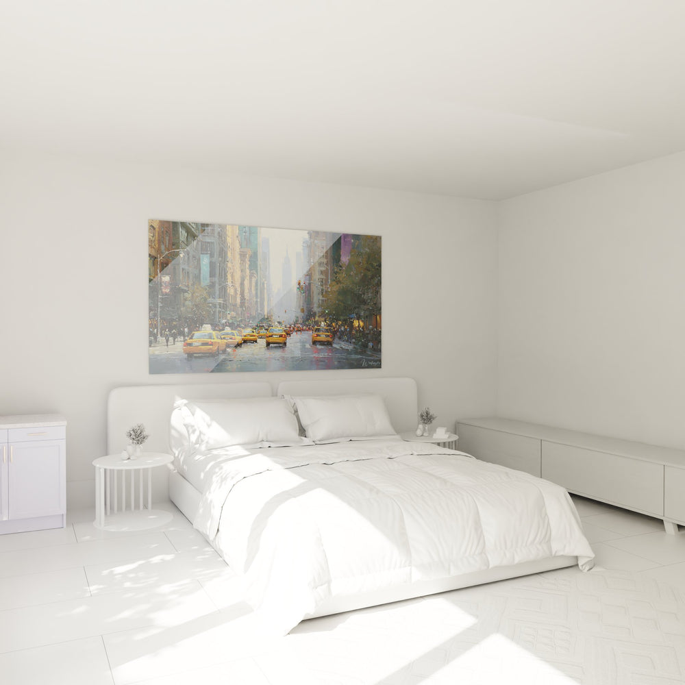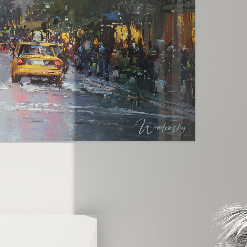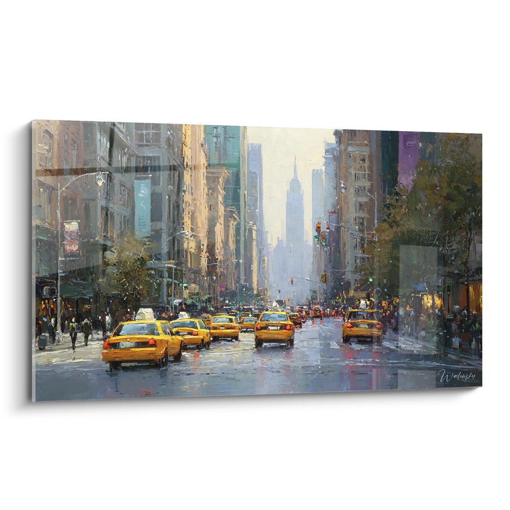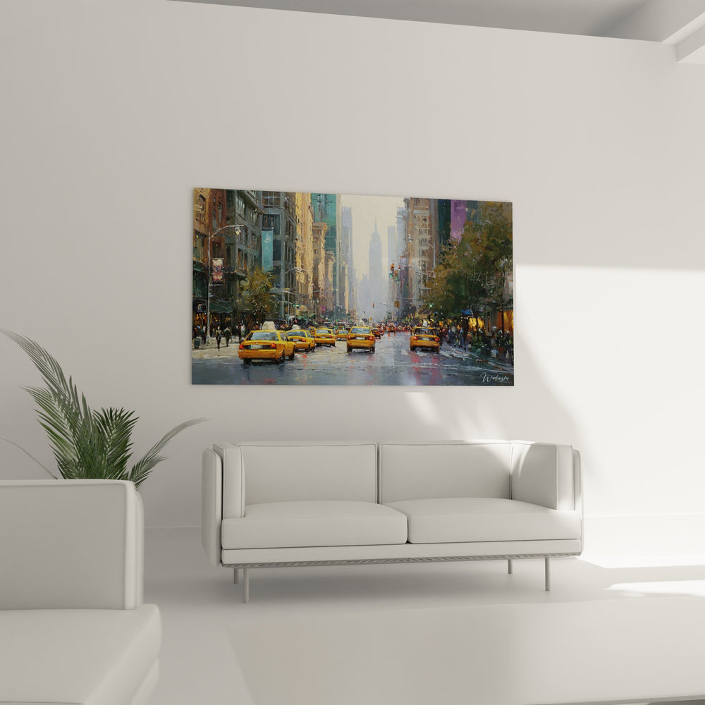 Ce tableau mural New York capture avec une remarquable intensité l'essence de la métropole américaine à travers une scène de rue emblématique. L'œuvre présente une avenue de Manhattan sous la pluie, où se déploie une procession de taxis jaunes iconiques qui serpentent dans le trafic urbain. Au premier plan, plusieurs yellow cabs brillent sous les reflets de l'asphalte mouillé, créant un jeu de lumières chatoyantes qui confère à cette peinture urbaine contemporaine une atmosphère cinématographique saisissante. Les buildings s'élèvent majestueusement de chaque côté de l'avenue, formant un canyon urbain typique de New York, tandis qu'au loin se dessine la silhouette reconnaissable de l'Empire State Building dans une brume légère. Cette œuvre d'art murale moderne révèle le dynamisme perpétuel de la ville qui ne dort jamais, où piétons et véhicules se mêlent dans un ballet urbain constant. L'artiste a su capter cette ambiance new-yorkaise authentique en privilégiant une technique picturale qui mélange réalisme et impressionnisme, donnant vie aux reflets sur le bitume humide et aux jeux d'ombres entre les gratte-ciels. Ce tableau décoratif Manhattan transformera instantanément votre intérieur en lui apportant l'énergie vibrante de la Big Apple.