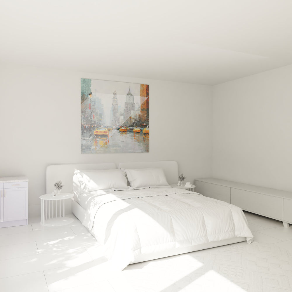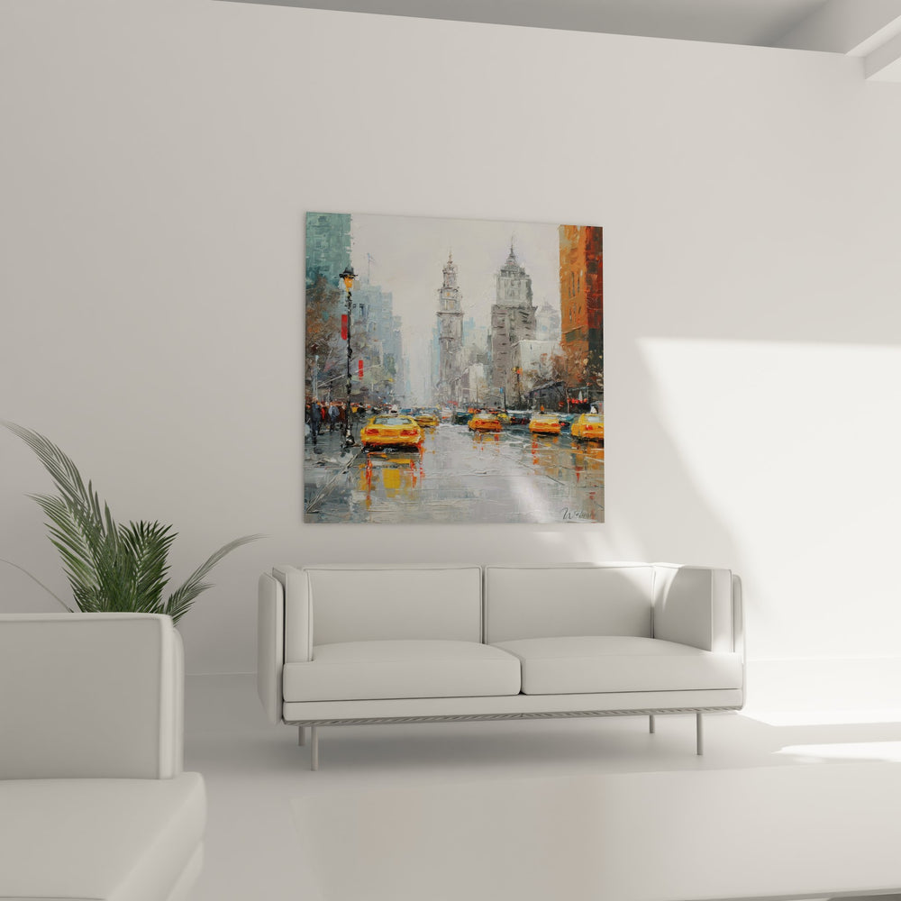 Ce tableau mural New York capture avec une intensité saisissante l'atmosphère unique d'une rue new-yorkaise sous la pluie. L'artiste a magistralement représenté une scène urbaine où les taxis jaunes iconiques de Manhattan traversent les rues mouillées, créant des reflets dorés sur l'asphalte brillant. Les gratte-ciel de New York s'élèvent majestueusement dans la brume, leurs silhouettes se perdant dans un ciel gris chargé de nuages. Cette peinture urbaine moderne révèle la beauté mélancolique de la métropole américaine, où les passants se hâtent sous leurs parapluies le long des trottoirs luisants. Les lampadaires vintage diffusent une lumière chaleureuse qui contraste avec la froideur de la pluie, tandis que les façades colorées des immeubles - du bleu-vert au rouge brique - apportent une richesse chromatique à cette composition dynamique. Ce tableau décoratif New York illustre parfaitement l'énergie perpétuelle de la ville qui ne dort jamais, même sous les intempéries. La technique picturale, aux allures impressionnistes, confère à cette œuvre d'art urbain une dimension émotionnelle profonde qui saura transformer n'importe quel espace de vie en galerie contemporaine.