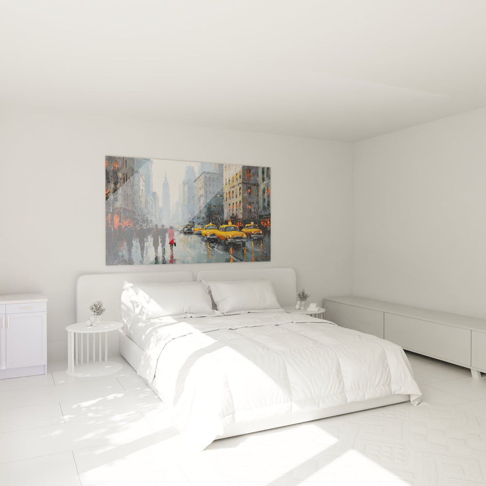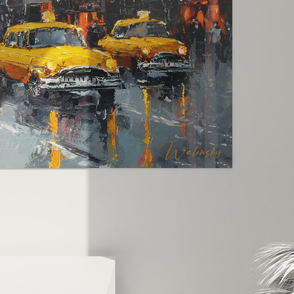 Tags : tableau new york, manhattan pluie, taxis jaunes, art urbain, décoration moderne