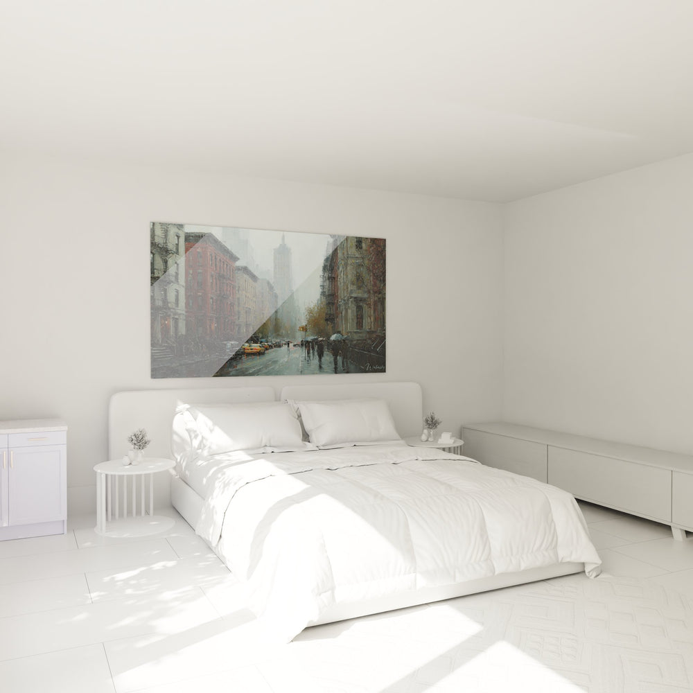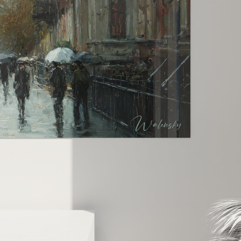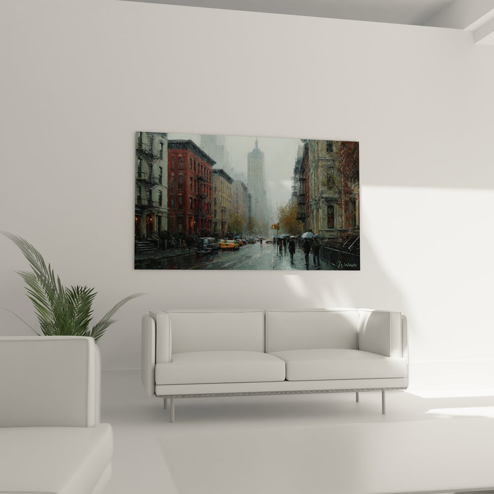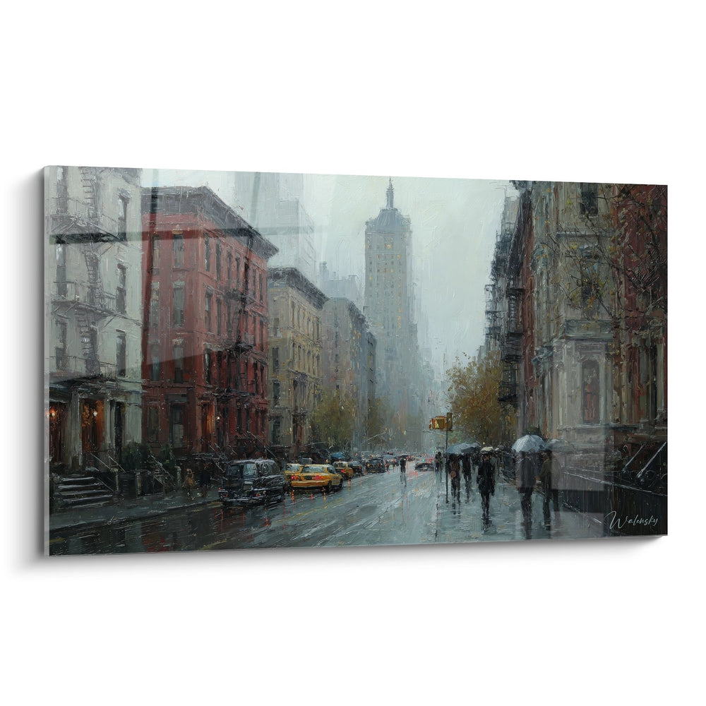 Tags : tableau New York pluie, art urbain Manhattan, décoration murale NYC, peinture rue new-yorkaise, Empire State Building art