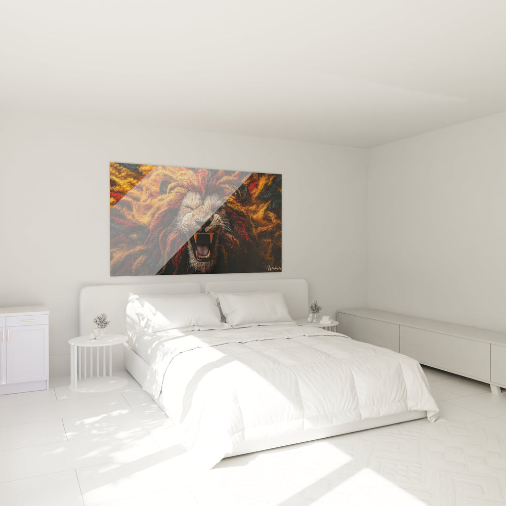 Ce tableau ne se contente pas de figer une image : il diffuse une énergie palpable, presque tactile. La précision extrême du visage du félin, rendue avec un réalisme saisissant, dialogue avec des motifs abstraits enchevêtrés, rappelant le crochet et la richesse des arts textiles ancestraux. Les nuances intenses d’orange incandescent, de rouge profond et de noirs mystérieux créent un jeu de contrastes qui capte le regard et embrase la pièce d’une chaleur captivante. Vous sentirez presque la vibration du souffle sauvage et la puissance souveraine du roi de la savane.