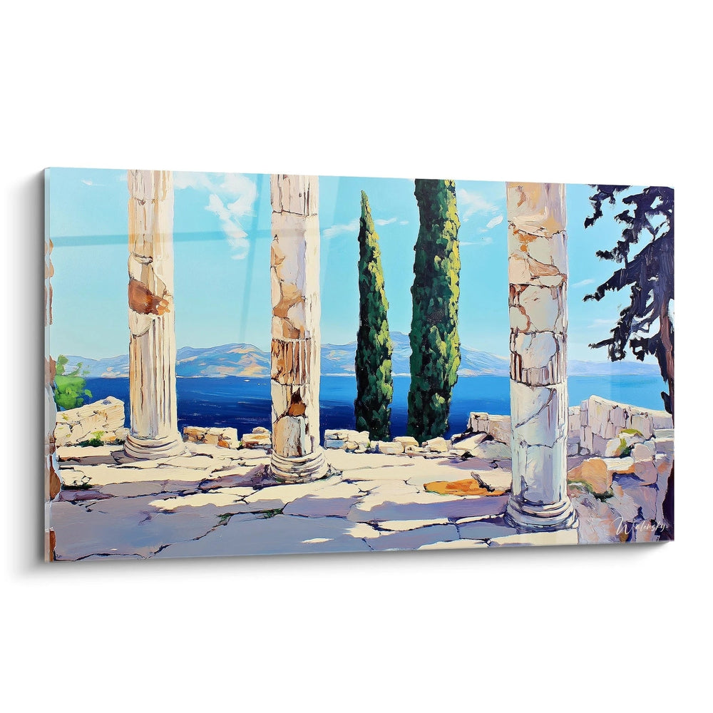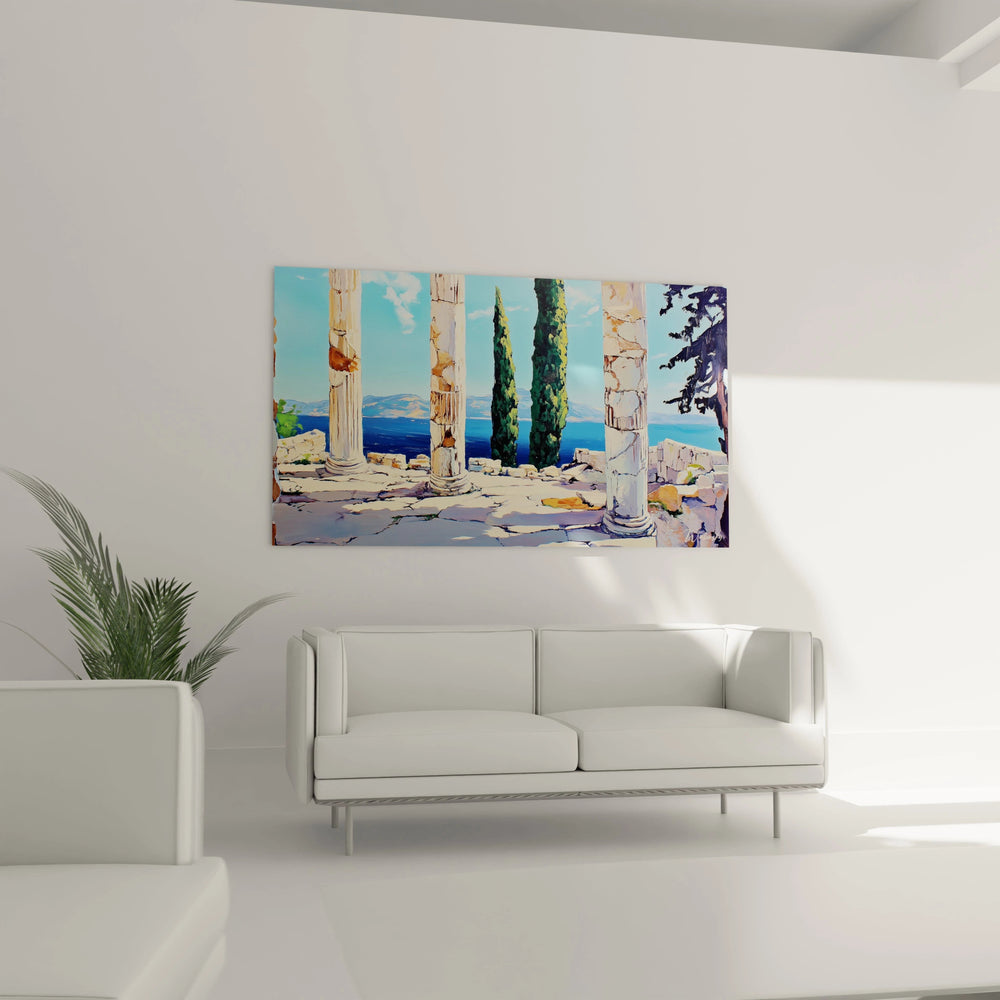 Chaque détail de ce tableau a été pensé pour vous transporter. La lumière naturelle méditerranéenne, douce et dorée, caresse les colonnes antiques aux textures patinées par les siècles, évoquant la chaleur de la pierre et la fraîcheur saline de la brise marine. Les cyprès dressés, symboles de ce paysage authentique, rythment la composition en apportant une verticalité élégante qui balance subtilement l’immensité de la mer.