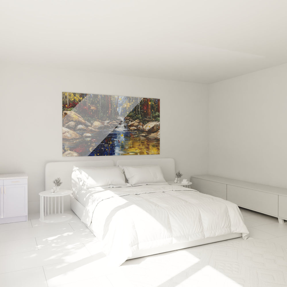 Cette œuvre d'art nature puise sa force symbolique dans la représentation de l'eau comme source de vie et de renouveau. La palette chromatique privilégie les tons chauds automnaux - ocres, dorés, rouges bordeaux - contrastant harmonieusement avec les bleus profonds du ruisseau. Ces couleurs évoquent la transition saisonnière et le cycle perpétuel de la nature, conférant à ce tableau décoratif paysage une dimension spirituelle et apaisante.
