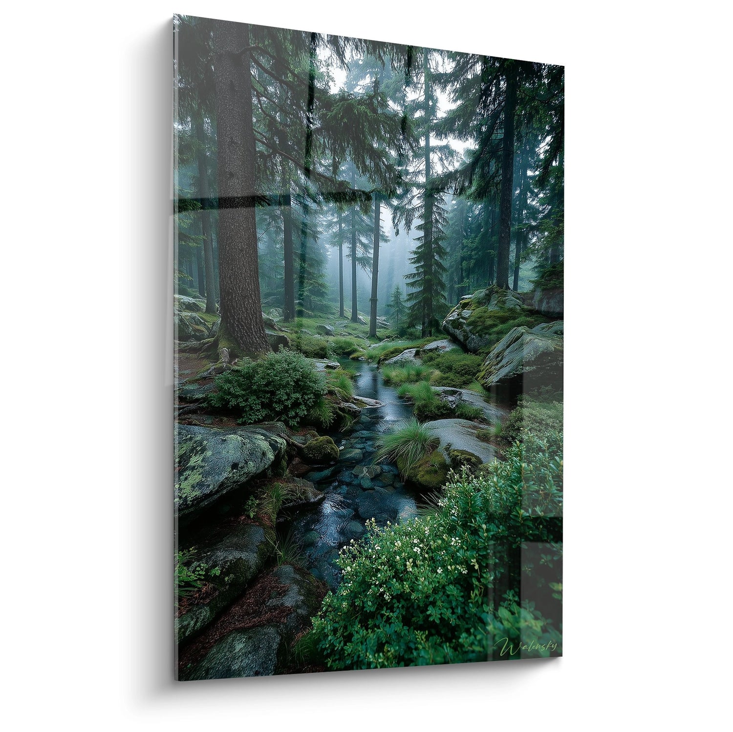 La palette chromatique de ce tableau nature apaisante se compose essentiellement de verts profonds et nuancés, du vert émeraude de la mousse au vert sombre des conifères, ponctués par les tons gris-bleu de la brume et les reflets argentés de l'eau. Cette harmonie de couleurs froides évoque la fraîcheur matinale et la pureté de l'air forestier. Symboliquement, l'eau représente le flux de la vie et la purification, tandis que les arbres ancestraux incarnent la sagesse et la permanence face au temps qui passe.
