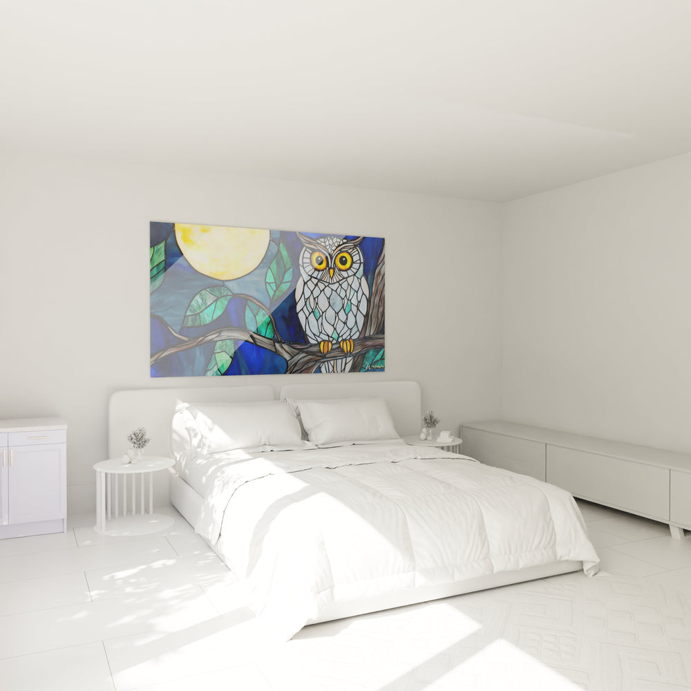 La composition de ce tableau hibou mystique style vitrail est harmonieusement équilibrée, avec le sujet principal positionné stratégiquement sur le côté droit. Le hibou est représenté de face, son regard hypnotique dirigé directement vers l'observateur, créant une connexion immédiate. La branche traverse l'espace horizontalement, servant d'ancrage visuel à la composition, tandis que la lune jaune occupe le coin supérieur gauche, établissant un contrepoids parfait.