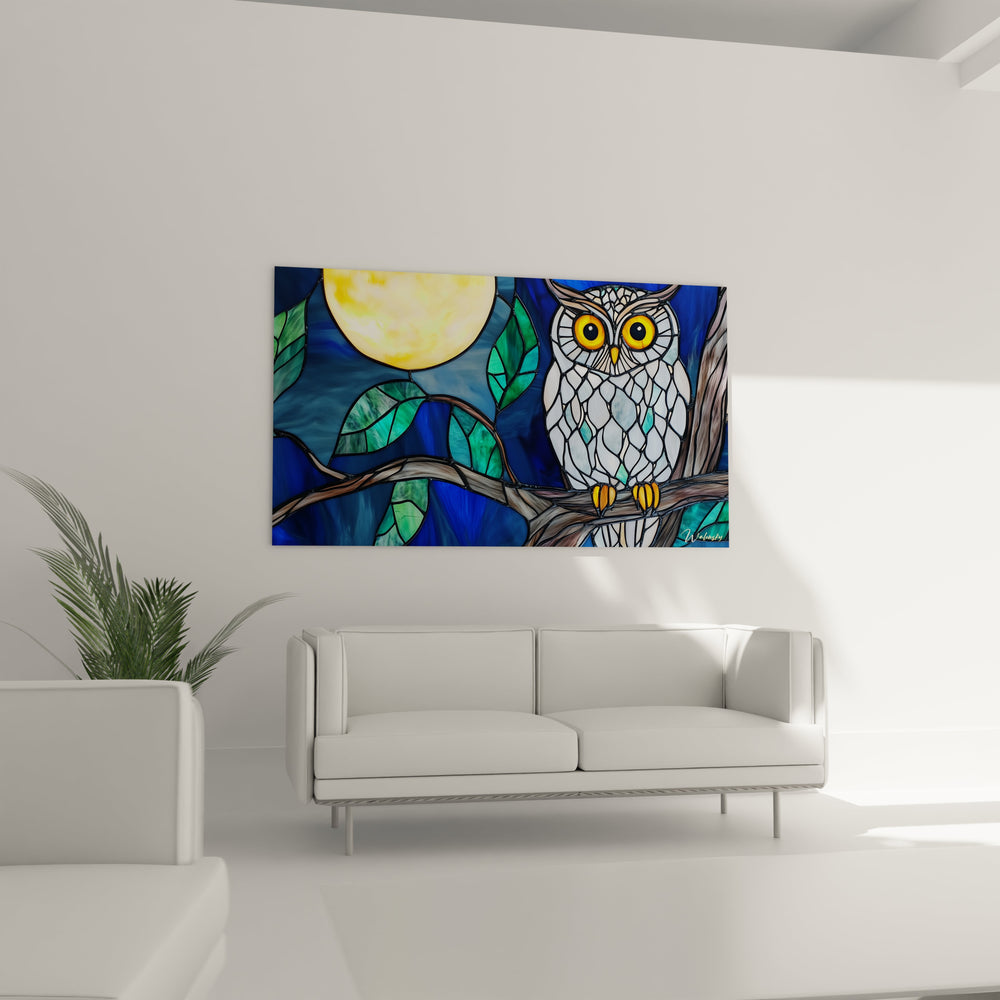 Ce tableau hibou nocturne captive immédiatement par sa technique exceptionnelle de vitrail, offrant une expérience visuelle saisissante. L'œuvre présente un magnifique hibou blanc aux yeux jaunes perçants, perché majestueusement sur une branche. La pleine lune lumineuse domine l'arrière-plan, créant un effet de halo doré. Les segments de verre colorés délimités par des lignes noires précises confèrent à ce tableau hibou nocturne une dimension presque mystique, où chaque élément semble capturer et transformer la lumière.
