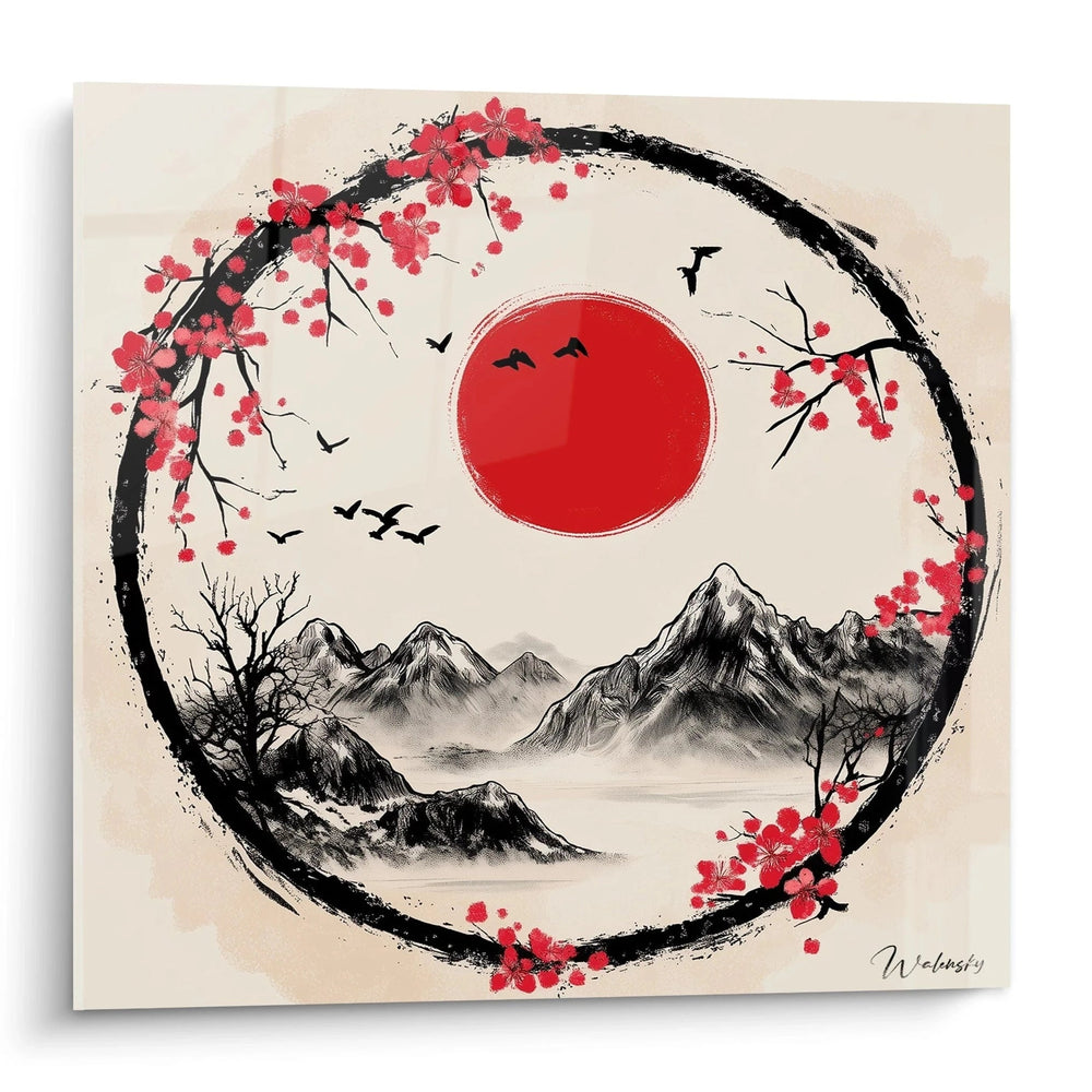 Ce tableau cerisier japonais présente une composition circulaire exceptionnelle qui capture l'essence de l'art zen traditionnel. L'œuvre révèle immédiatement un soleil rouge éclatant centré dans un cercle noir, symbole de l'harmonie parfaite entre les éléments naturels. Les branches de cerisier en fleurs s'épanouissent délicatement autour de cette structure circulaire, créant un cadre naturel d'une beauté saisissante. Cette décoration murale cerisier zen combine subtilement les tons rouge coral des fleurs avec l'intensité du soleil vermillon, tandis que des oiseaux en vol ajoutent une dimension dynamique à l'ensemble. Les montagnes grises en arrière-plan évoquent la profondeur et la sérénité caractéristiques de l'art japonais traditionnel.