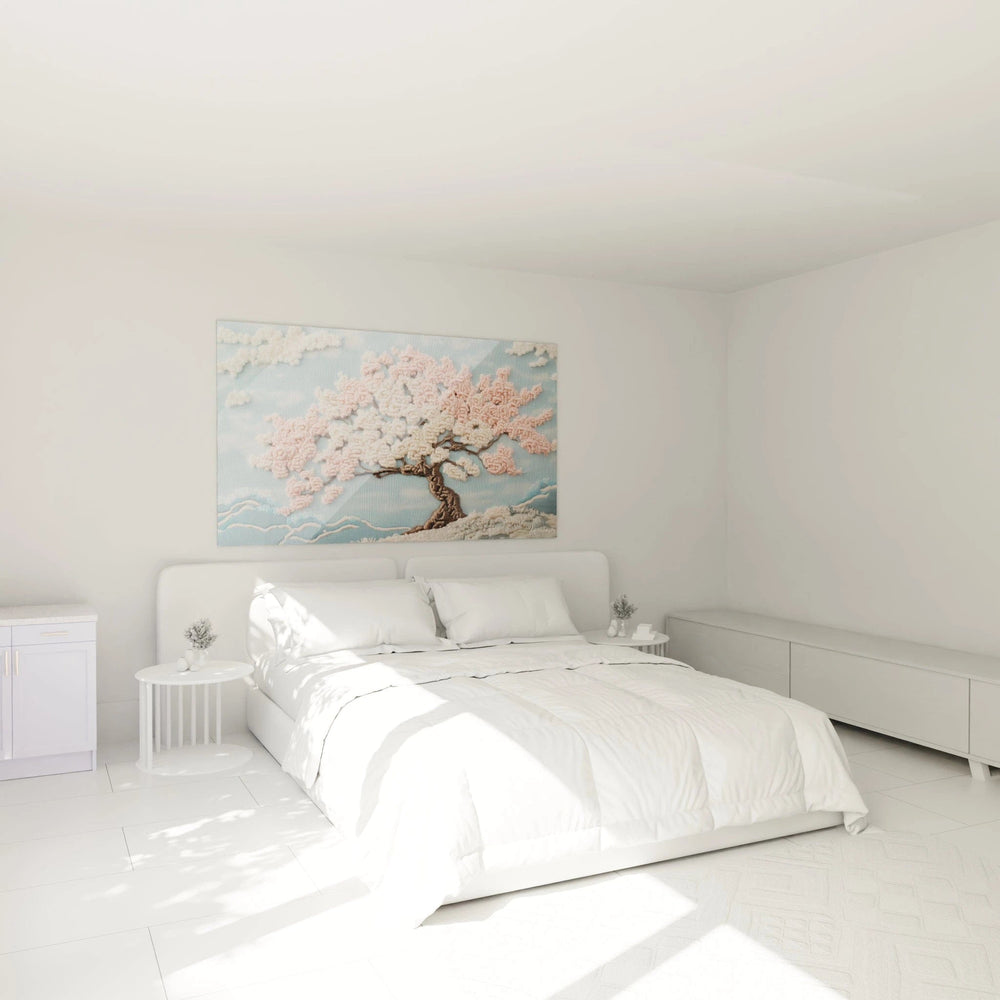 Un autre aspect remarquable est la façon dont cette décoration murale sakura intègre harmonieusement différentes textures au sein d'une composition cohérente. Le passage fluide entre les différentes parties de l'œuvre - du tronc solide aux fleurs éthérées, des nuages cotonneux aux vagues rythmiques - témoigne d'une maîtrise technique exceptionnelle et d'une vision artistique aboutie. Chaque élément raconte sa propre histoire tactile tout en contribuant à la narration globale de ce moment de grâce printanière capturé dans les fils.