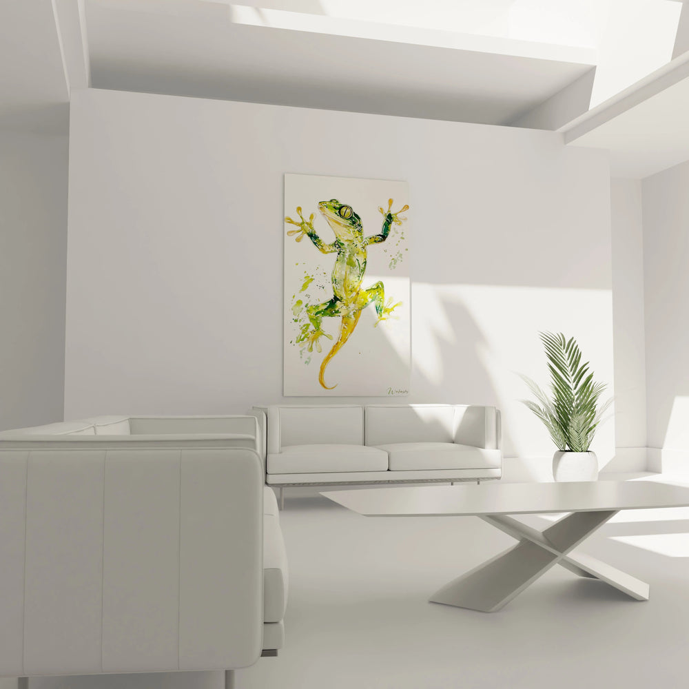 Pour une mise en valeur optimale, un éclairage direct mais non agressif mettra en évidence les subtilités chromatiques de l'art mural reptile. Un cadre fin et discret, dans des tons naturels comme le bois clair ou un métal brossé, complétera harmonieusement l'ensemble sans détourner l'attention de l'œuvre elle-même. Ce tableau salamandre s'harmonisera particulièrement bien avec un mobilier aux lignes épurées et des textiles aux teintes vertes et ambrées.