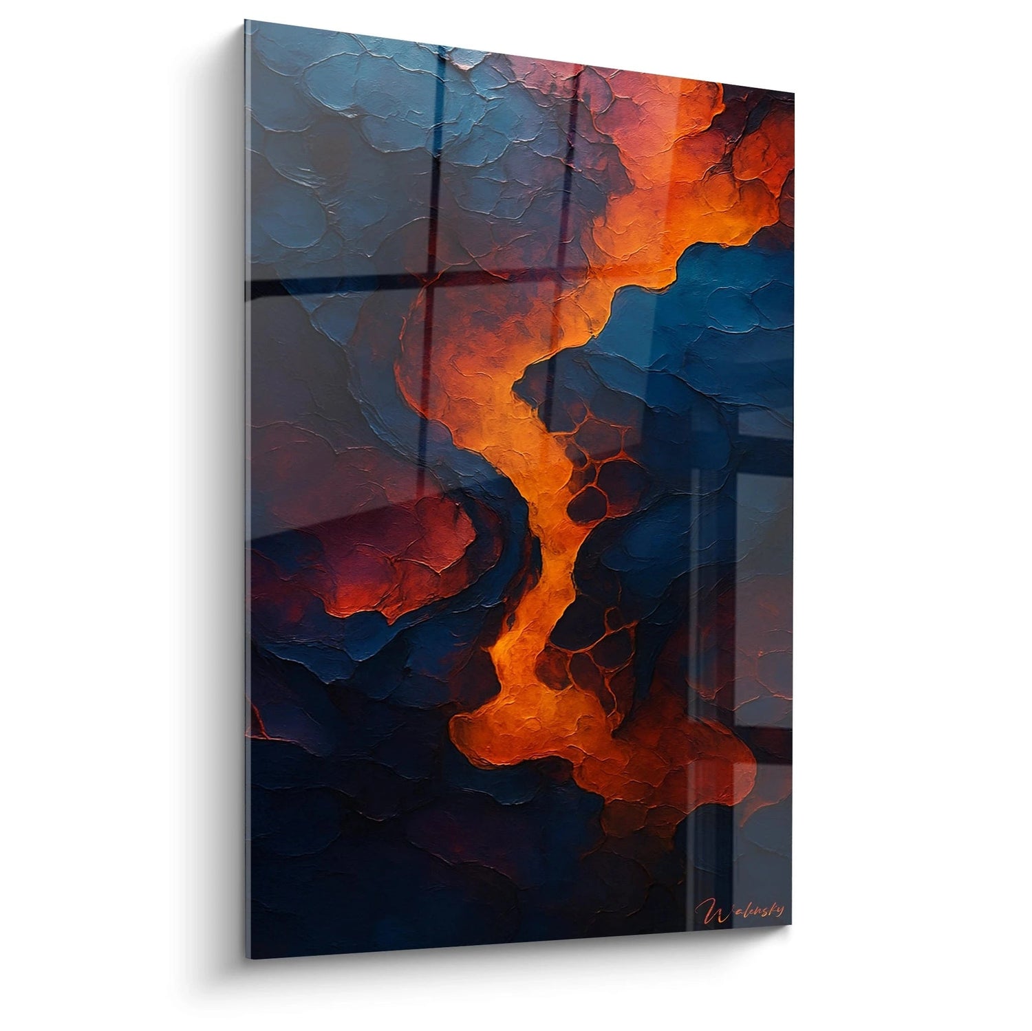 Imaginez votre salon ou votre espace personnel illuminé par les contrastes puissants de ce tableau. Cette œuvre sculpturale se dévoile au fil des angles et des lumières, ses reliefs créant un jeu d’ombres naturelles qui donnent vie à chaque détail. L’intensité des teintes — des profondeurs du bleu aux flammes de l’orange et du rouge — s’harmonise avec une texture généreuse qui rappelle la force brute de la nature en mouvement.