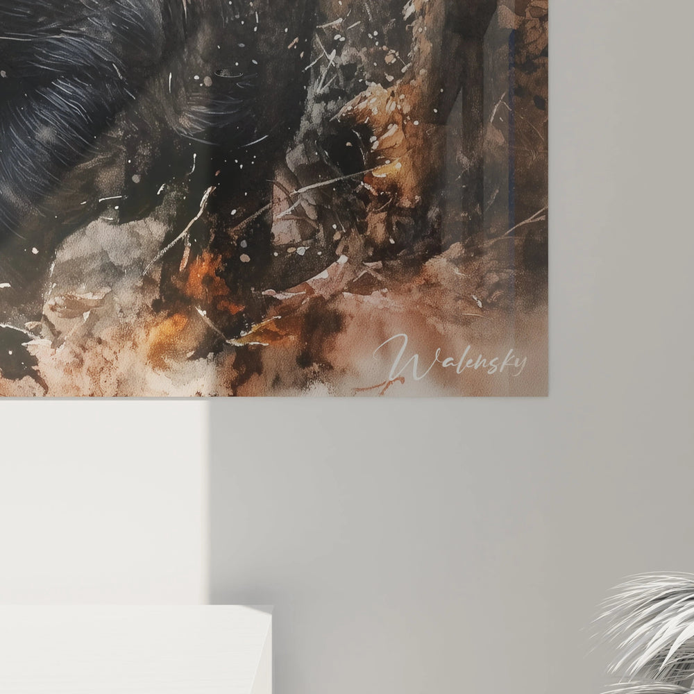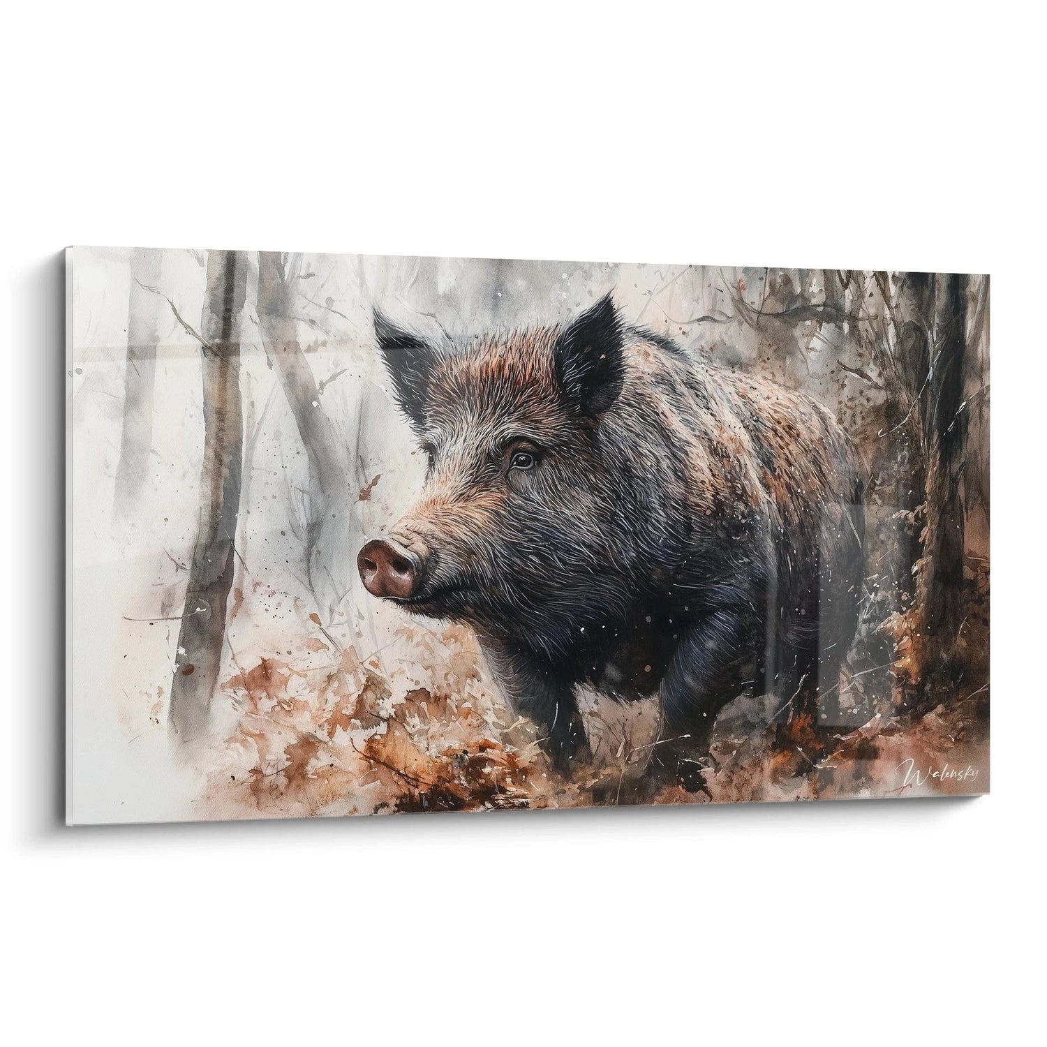 Ce tableau sanglier se distingue par un traitement remarquable des textures, particulièrement visible dans le rendu des soies de l'animal. Chaque poil semble avoir été méticuleusement représenté, créant un effet tactile presque palpable. La technique d'aquarelle maîtrisée permet des transitions subtiles entre les zones d'ombre et de lumière, conférant au pelage du sanglier une dimension réaliste extraordinaire. Les éclaboussures délicates et les taches diffuses ajoutent une qualité organique à l'ensemble.