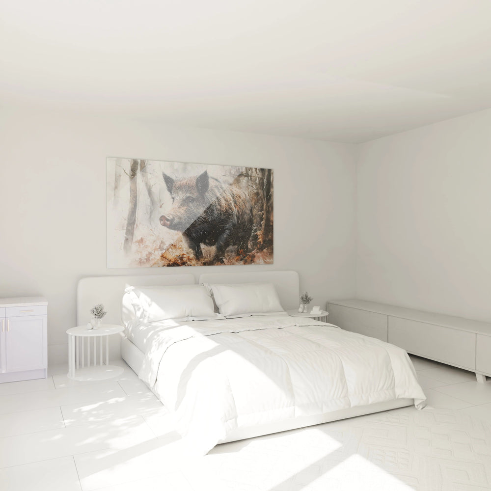 La décoration murale sanglier se distingue également par le traitement atmosphérique de l'arrière-plan forestier. Les éclaboussures délicates et les zones plus floues créent une ambiance mystérieuse qui contraste avec la netteté du sujet principal. Cette dualité technique est la signature d'un artiste qui maîtrise parfaitement son médium et comprend intimement son sujet, faisant de cette œuvre une pièce d'art mural animalier véritablement exceptionnelle.