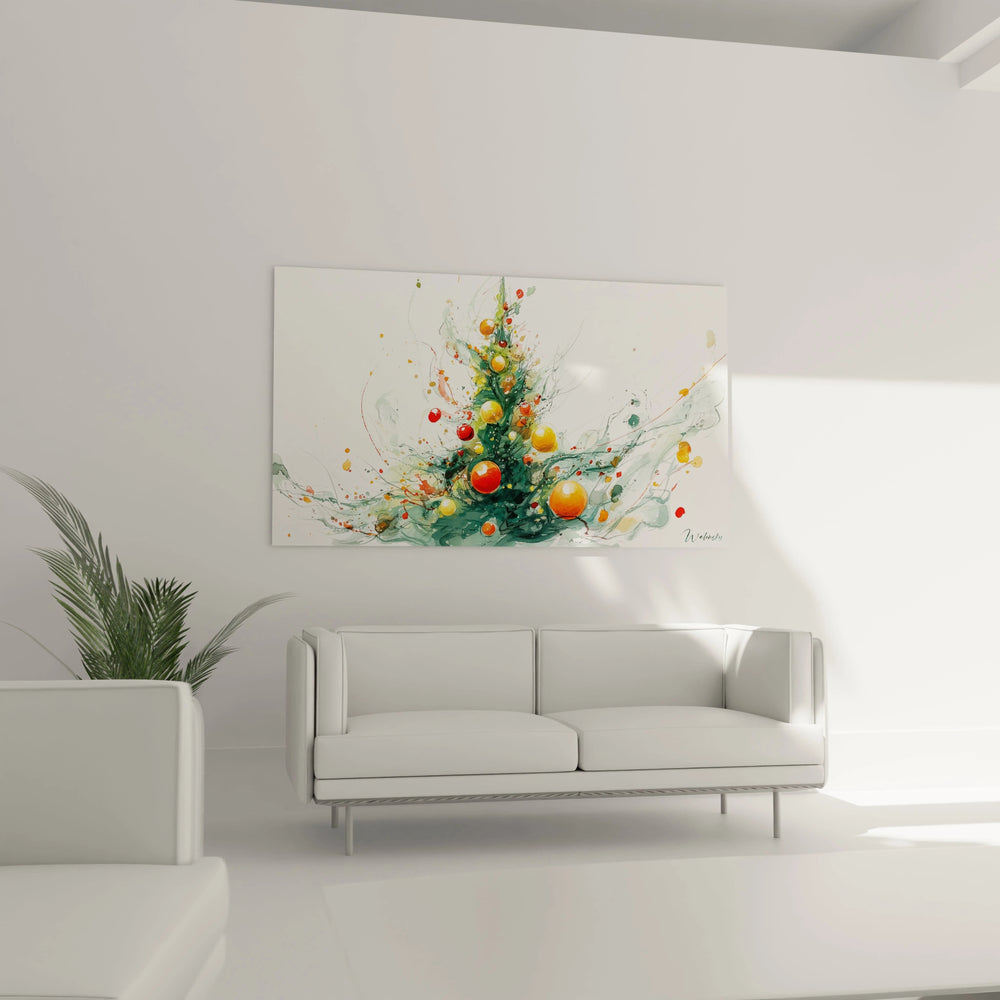 Cette décoration murale sapin éclatante s'épanouit particulièrement dans des environnements contemporains où ses couleurs vives peuvent contraster harmonieusement avec des tons neutres. L'œuvre demande un éclairage indirect qui permet aux nuances aquarelles de révéler toute leur subtilité sans créer de reflets perturbants sur les zones brillantes des ornements. Les murs blancs ou gris clair constituent l'arrière-plan idéal pour faire ressortir la richesse chromatique de ce tableau sapin moderne festif. Dans un salon ou une salle à manger, cette pièce peut servir de point focal saisonnier, apportant l'esprit de Noël avec une sophistication artistique qui transcende la décoration traditionnelle. L'association avec des éléments décoratifs aux tons dorés ou cuivrés amplifie la chaleur festive de l'ensemble.