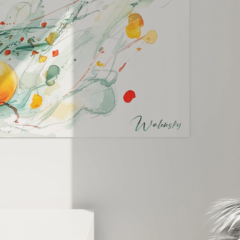 La composition de cette décoration murale sapin contemporaine s'articule autour d'un axe vertical central qui évoque la silhouette traditionnelle de l'arbre de Noël. Le tableau sapin aquarelle dynamique présente une structure pyramidale déstructurée où les éléments se dispersent vers les bords dans un mouvement centrifuge. L'équilibre visuel repose sur la répartition harmonieuse des masses colorées, avec les ornements les plus imposants positionnés stratégiquement pour créer des points d'ancrage visuels. Les lignes directrices suivent les courbes fluides des éclaboussures d'aquarelle, guidant l'œil du spectateur dans une danse visuelle qui commence au centre et rayonne vers l'extérieur.