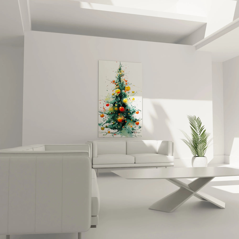 Ce tableau sapin aquarelle moderne présente une composition saisissante où la technique de l'aquarelle transforme l'arbre traditionnel en une œuvre d'art contemporaine. La première impression révèle un tableau sapin boules colorées où les ornements orange et rouge semblent flotter dans un nuage de verdure fluide. L'artiste a capturé l'essence festive tout en conservant une approche artistique libre et expressive. Les contours dissolus et les couleurs qui se mélangent créent une atmosphère magique particulièrement adaptée à une décoration murale sapin moderne.