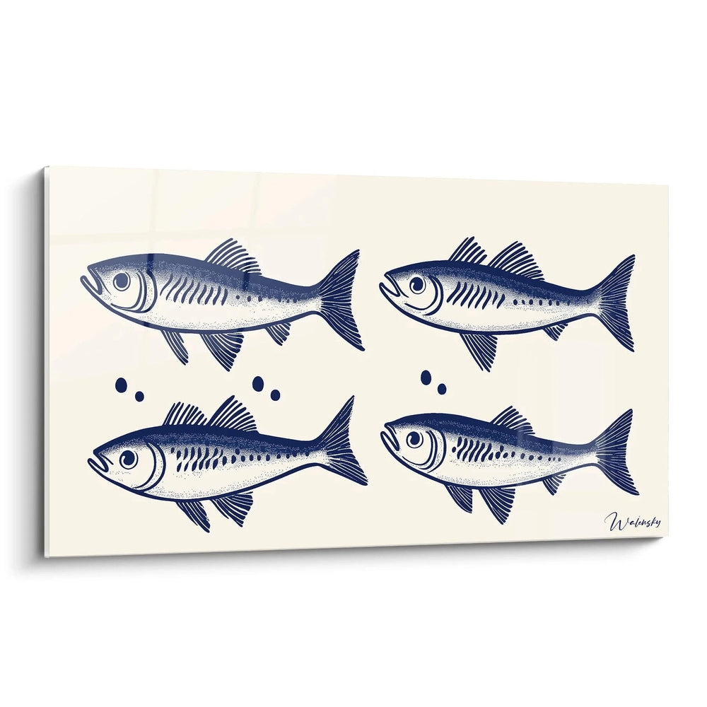Ce tableau évoque la poésie subtile d’un ballet aquatique, où chaque sardine est dessinée avec une précision délicate, mettant en valeur leur silhouette fluide et leur éclat argenté. Cette représentation graphique, épurée et contemporaine, célèbre la beauté souvent méconnue de ces poissons marins, symbole de liberté et de mouvement. La composition quadruple crée une dynamique visuelle unique qui attire et apaise le regard simultanément.