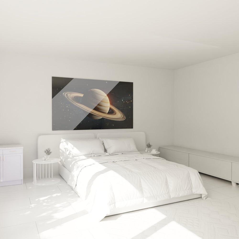 Ce magnifique tableau mural Saturne capture toute la grandeur de la sixième planète du système solaire dans une représentation artistique saisissante. L'œuvre présente Saturne avec ses anneaux iconiques dans des tons dorés et beiges qui évoquent la noblesse cosmique. La décoration murale espace révèle les détails fascinants de cette géante gazeuse, avec ses bandes atmosphériques délicatement nuancées et ses anneaux planétaires finement ciselés qui semblent flotter dans l'obscurité de l'espace. L'arrière-plan étoilé parsemé de points lumineux crée une profondeur spatiale immersive, tandis que les reflets subtils sur la surface planétaire ajoutent une dimension réaliste à cette œuvre d'art spatial moderne. Ce tableau astronomie décorative transforme n'importe quel mur en fenêtre vers l'infini cosmique, offrant une évasion visuelle vers les merveilles de notre système solaire. La composition équilibrée et les jeux de lumière font de cette pièce un véritable chef-d'œuvre de l'art contemporain spatial.