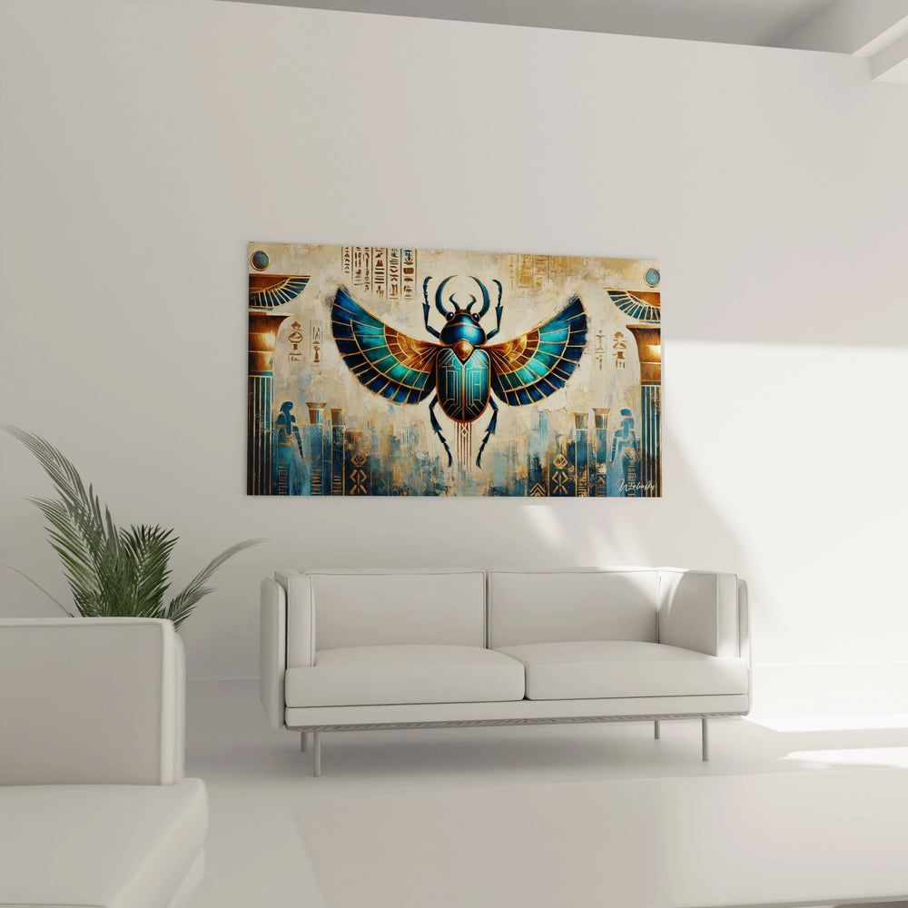 Au cœur de cette création, le scarabée déploie ses ailes dorées dans un mouvement de grâce et de puissance. Imaginez la sensation unique d’accueillir chez vous une pièce qui raconte une histoire millénaire, où chaque détail raconte la protection et l'équilibre que ce symbole sacré représente. Les hiéroglyphes stylisés et la touche d’or éclatante offrent un dialogue harmonieux entre l’ancien et le contemporain, apportant à votre espace une présence profondément spirituelle et élégante.