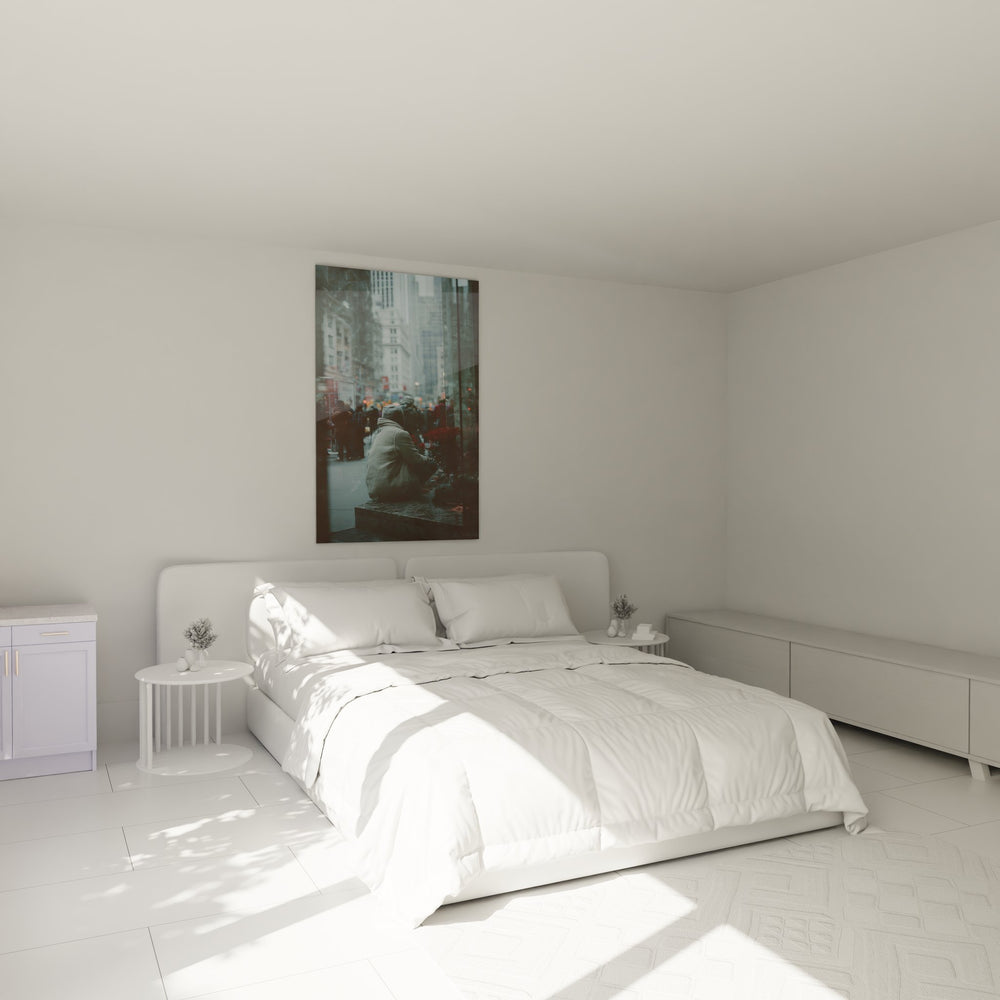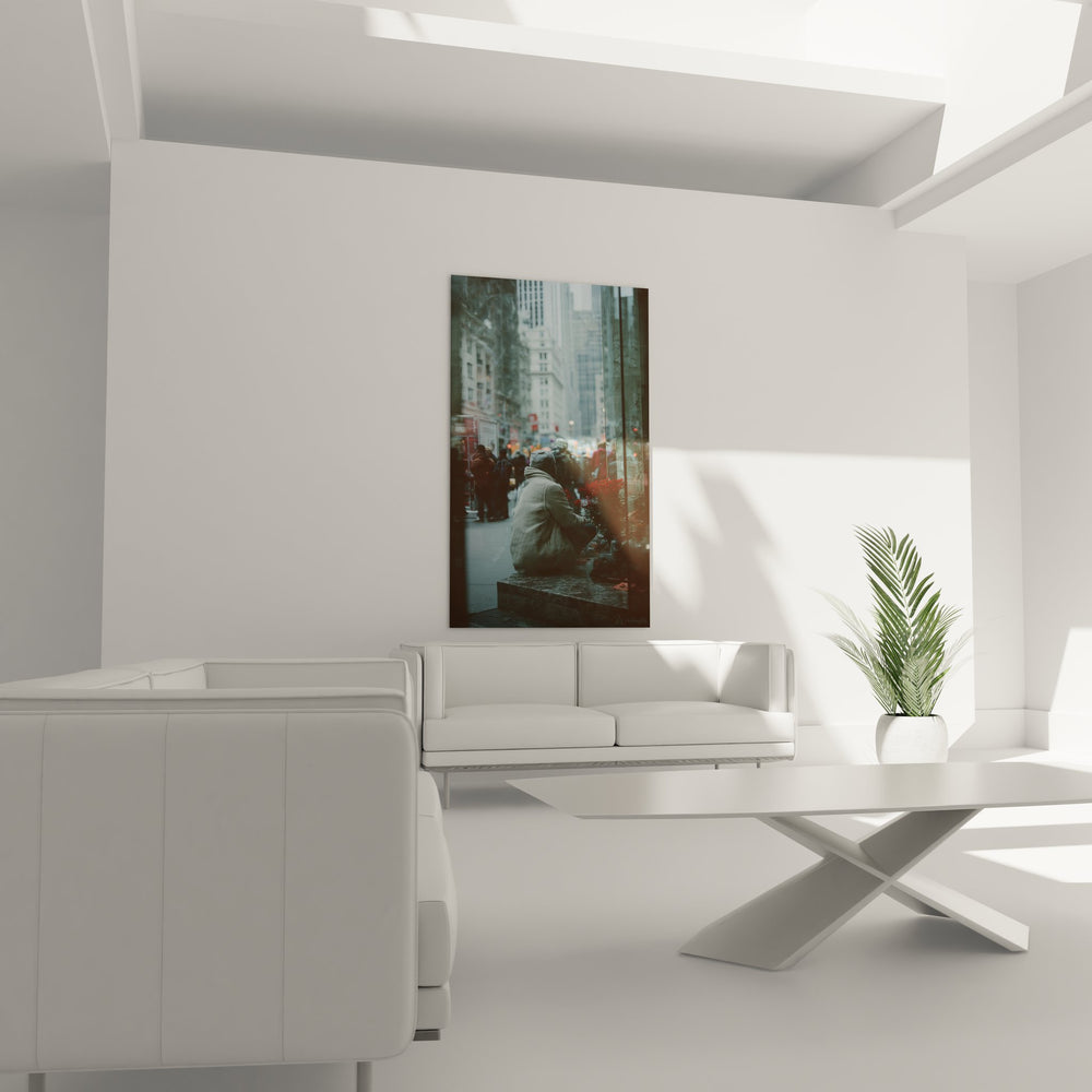 Ce tableau mural scène de rue capture avec une intensité saisissante l'essence de la vie urbaine new-yorkaise. L'œuvre présente un personnage solitaire assis sur les marches d'un bâtiment, enveloppé dans un manteau gris qui se fond harmonieusement avec l'atmosphère brumeuse de la métropole. Le tableau New York street art révèle une composition photographique d'une rare justesse, où la profondeur de champ crée un effet de flou artistique sur les gratte-ciels emblématiques en arrière-plan. La décoration murale urbaine moderne s'exprime ici à travers un jeu subtil de reflets sur les surfaces vitrées et mouillées du pavé. Les passants se transforment en silhouettes anonymes, témoignant de l'isolement paradoxal qui caractérise les grandes métropoles. Ce tableau décoratif ville moderne transcende la simple représentation pour devenir une méditation visuelle sur la condition urbaine contemporaine. L'artiste a su saisir l'instant où la photographie artistique New York rencontre l'émotion pure, créant une œuvre qui résonne avec l'expérience universelle de la solitude en milieu urbain. Les tons froids et la lumière tamisée confèrent à ce tableau ambiance métropolitaine une dimension contemplative exceptionnelle, parfaite pour enrichir tout espace de vie moderne.