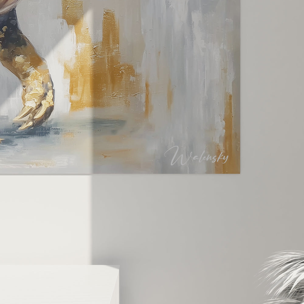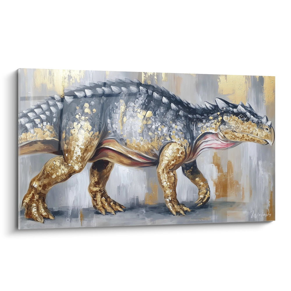 La palette dorée du tableau Scutosaurus évoque la richesse et l'élégance, transformant cette créature antique en symbole de luxe. Les tons or et bronze créent un contraste saisissant avec les nuances grises, symbolisant l'alliance entre force brute et raffinement. Cette œuvre d'art préhistorique dorée représente la persévérance face au temps qui passe, faisant de ce tableau un élément décoratif chargé de sens et d'histoire.