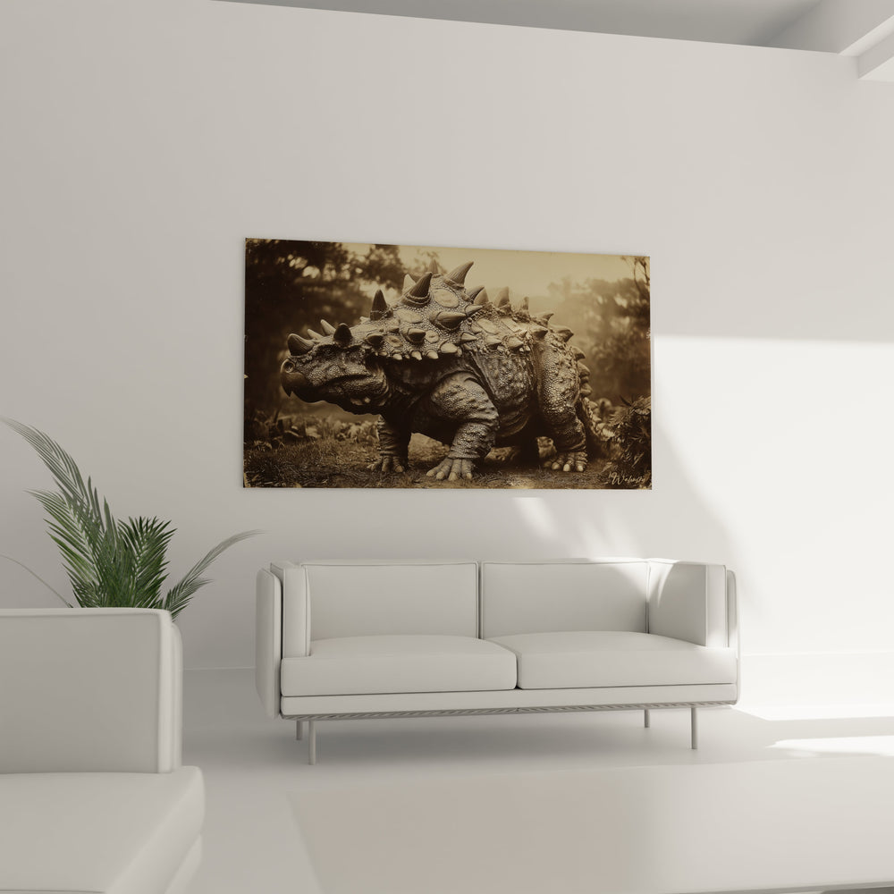 Ce tableau mural Scutosaurus présente une représentation saisissante d'un dinosaure cuirassé dans un style photographique vintage sépia. L'art mural dinosaure capture avec un réalisme troublant les détails anatomiques de ce géant préhistorique, mettant en valeur sa carapace épineuse caractéristique et ses nombreuses protubérances osseuses. Le tableau décoratif préhistorique révèle la musculature puissante de l'ankylosaure, ses pattes robustes et sa tête massive ornée de cornes défensives. Cette décoration murale dinosaure s'inspire des reconstitutions paléontologiques les plus fidèles, offrant un art paléontologique mural d'exception. Les tableaux fauna préhistorique de cette qualité transforment instantanément l'atmosphère d'une pièce, créant une ambiance mystérieuse et éducative. Le rendu photographique vintage confère à cette œuvre d'art dinosaure une authenticité remarquable, comme une photographie d'époque découverte dans les archives d'un musée d'histoire naturelle. Cette représentation détaillée fait de ce tableau mural paléontologie une pièce de choix pour les passionnés de sciences naturelles et d'art animalier préhistorique.