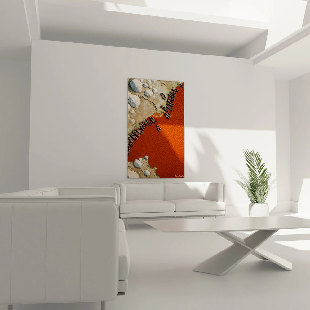 Pour sublimer cette pièce, associez-la à des meubles en matières naturelles et textures variées, qui feront écho aux éléments du tableau. Une lumière douce et indirecte viendra révéler la richesse des contrastes et la profondeur des reliefs, tandis que des accessoires en bois flotté ou en céramique blanche renforceront l’harmonie avec cette vision aérienne abstraite.