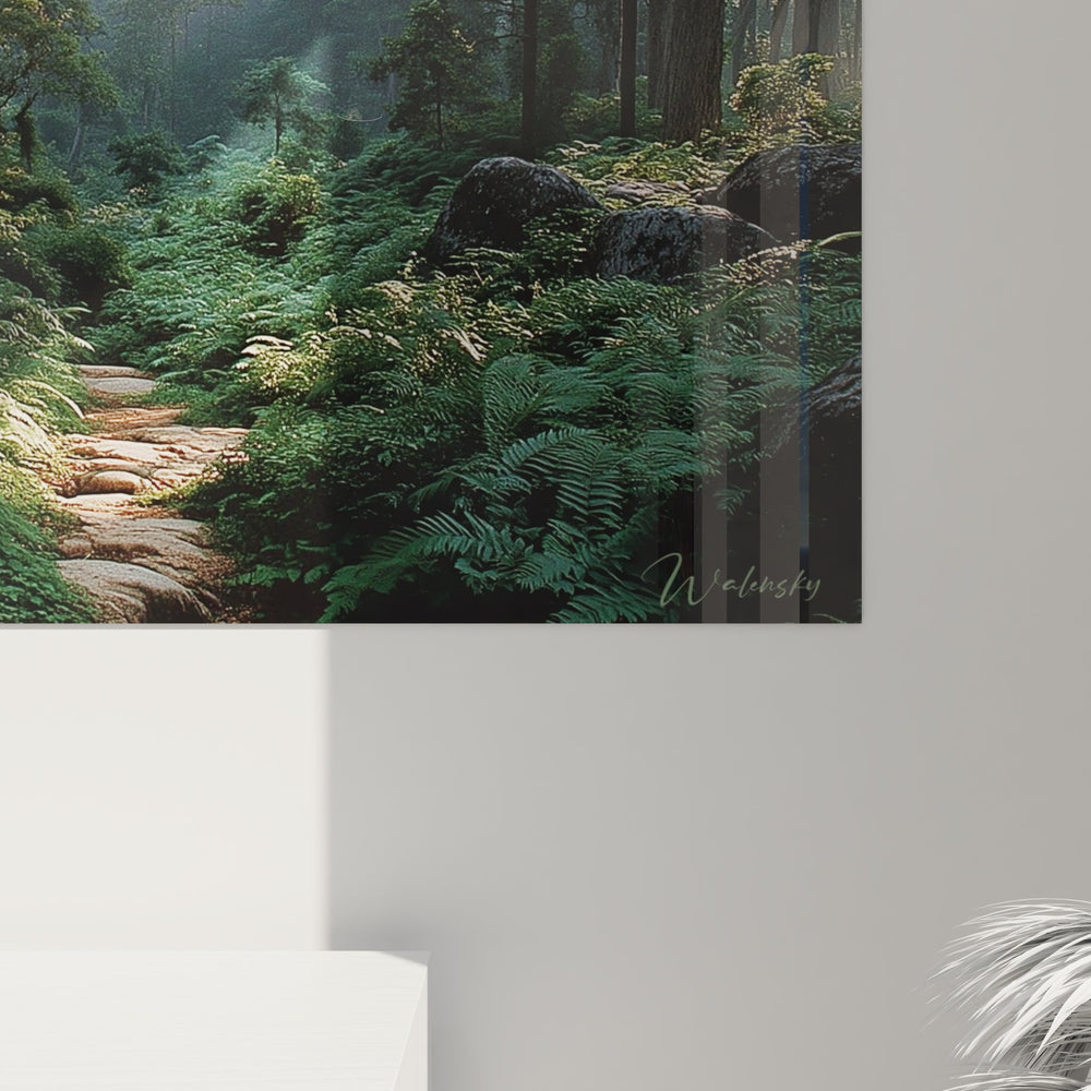 Ce tableau mural forêt présente une vision enchanteresse d'un sentier forestier serpentant à travers une végétation luxuriante. L'artiste Walensky a magistralement capturé l'essence d'une forêt mystique où la lumière filtrée crée une atmosphère contemplative et apaisante. Au premier plan, des fougères géantes tapissent le sol forestier, leurs frondes délicatement éclairées par les rayons solaires perçant la canopée. Le chemin de pierre guide naturellement le regard vers les profondeurs de cette forêt primordiale, invitant à la découverte et à l'évasion. Les arbres centenaires aux troncs imposants structurent la composition, leurs branches entrelacées formant une voûte naturelle protectrice. Cette œuvre d'art nature révèle une technique picturale raffinée, où chaque détail de la végétation est rendu avec un réalisme saisissant. Les jeux d'ombre et de lumière créent une profondeur remarquable, transformant ce tableau décoratif forêt en une véritable fenêtre ouverte sur un monde préservé. Cette représentation de paysage forestier enchanteur évoque la sérénité des sous-bois et la majesté de la nature sauvage, offrant une évasion contemplative parfaite pour tout intérieur moderne.