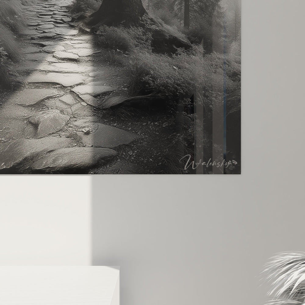La palette monochrome de ce tableau forêt mystérieuse amplifie la dimension spirituelle de l'œuvre. Les nuances de gris, du plus profond au plus lumineux, créent une profondeur émotionnelle remarquable. Cette décoration murale nature symbolise le voyage de l'âme, le chemin de pierre représentant notre parcours de vie à travers les épreuves et les découvertes, guidé par la sagesse ancestrale de la forêt.