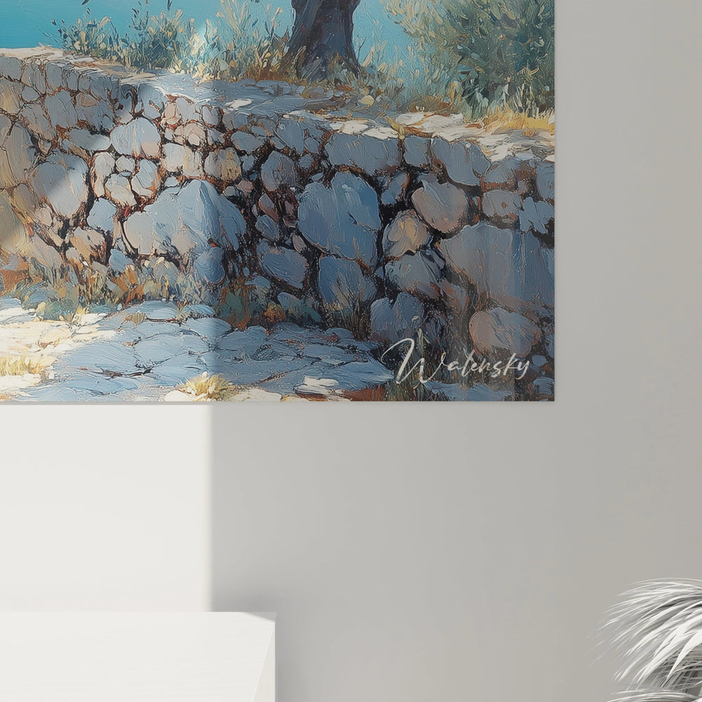La composition de ce tableau méditerranéen style impressionniste repose sur un équilibre harmonieux entre plusieurs plans distincts. Au premier plan, le chemin pierreux et les murets en pierre sèche créent une entrée dynamique dans l'œuvre, guidant naturellement l'œil du spectateur. Les oliviers argentés sont stratégiquement placés sur les côtés, encadrant la vue comme des gardiens naturels et renforçant l'effet de perspective.