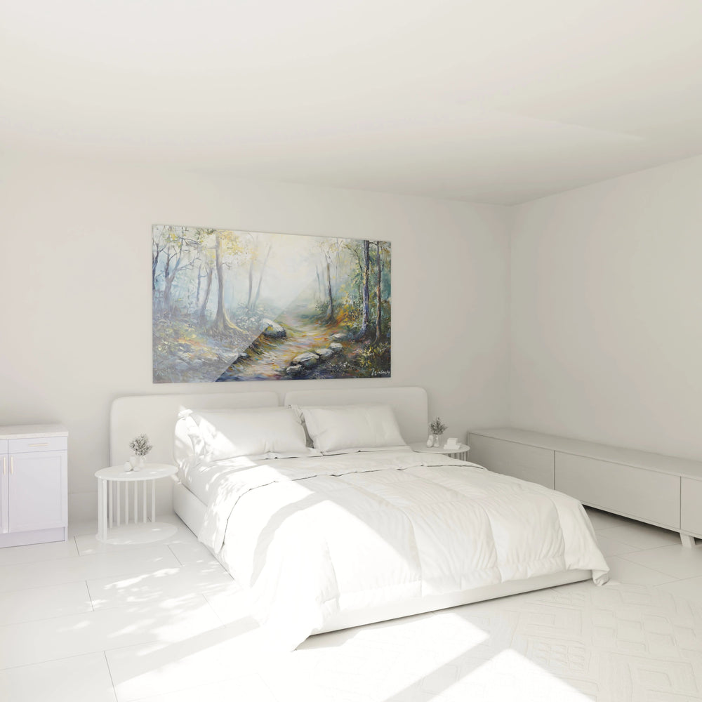 Ce tableau forêt captive par sa représentation atmosphérique d'un chemin forestier baigné dans une brume matinale éthérée. L'œuvre présente un sentier sinueux bordé de pierres pâles qui guide le regard vers une percée lumineuse au centre de la composition. Les grands arbres élancés encadrent majestueusement ce passage, leurs silhouettes sombres se détachant dans la lueur diffuse. Les teintes bleutées et la luminosité centrale créent une profondeur mystérieuse, invitant le spectateur à s'aventurer dans ce paysage sylvestre empreint de sérénité.