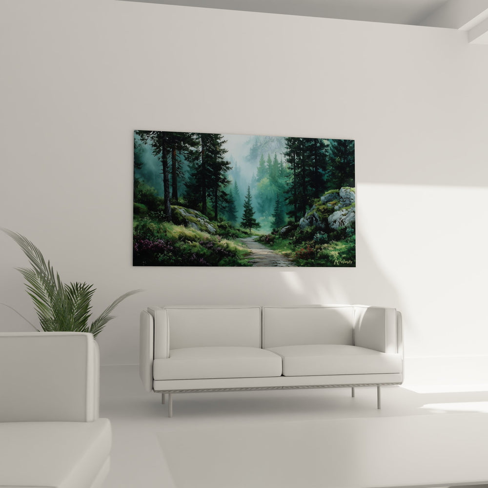 Ce tableau mural forêt nous transporte dans l'intimité d'un sentier forestier brumeux où la nature révèle sa beauté la plus mystérieuse. L'artiste a magistralement capturé l'atmosphère envoûtante d'un chemin de randonnée en forêt serpentant à travers une végétation luxuriante. Les conifères majestueux s'élèvent de part et d'autre du sentier, leurs silhouettes sombres contrastant avec la brume matinale en forêt qui filtre la lumière naturelle. Au premier plan, des rochers moussus et une végétation dense composée de fougères et de bruyères violettes créent un tapis naturel d'une richesse exceptionnelle. Ce tableau paysage forestier révèle chaque détail avec une précision remarquable : la texture rugueuse des écorces, la douceur veloutée de la mousse qui recouvre les pierres, et les jeux de lumière qui percent à travers la canopée. L'œuvre invite à la contemplation et à l'évasion, transportant l'observateur au cœur d'une forêt de conifères mystérieuse où règnent sérénité et harmonie. Cette représentation artistique de la nature sauvage capture l'essence même de la forêt tempérée, avec ses atmosphères changeantes et ses ambiances feutrées qui caractérisent les sous-bois profonds.