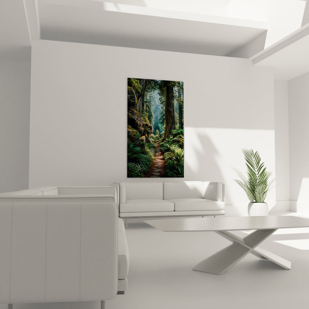 La palette chromatique naturelle de ce tableau évoque la sérénité et l'harmonie avec la nature. Les verts profonds des fougères contrastent subtilement avec les bruns chauds des séquoias, tandis que les touches de lumière dorée apportent une dimension spirituelle à l'ensemble. Cette décoration murale nature symbolise le chemin de vie, l'introspection et la connexion profonde avec l'environnement naturel, créant un véritable havre de paix visuel.