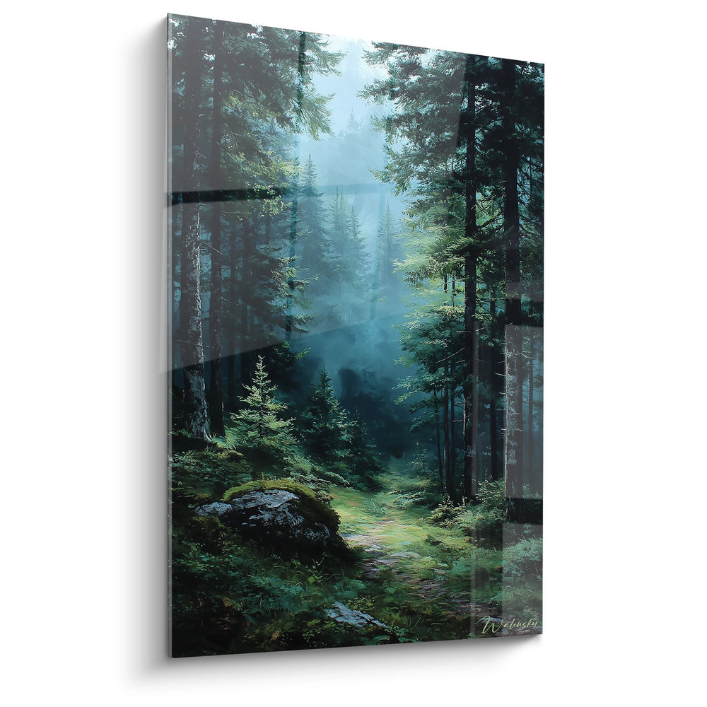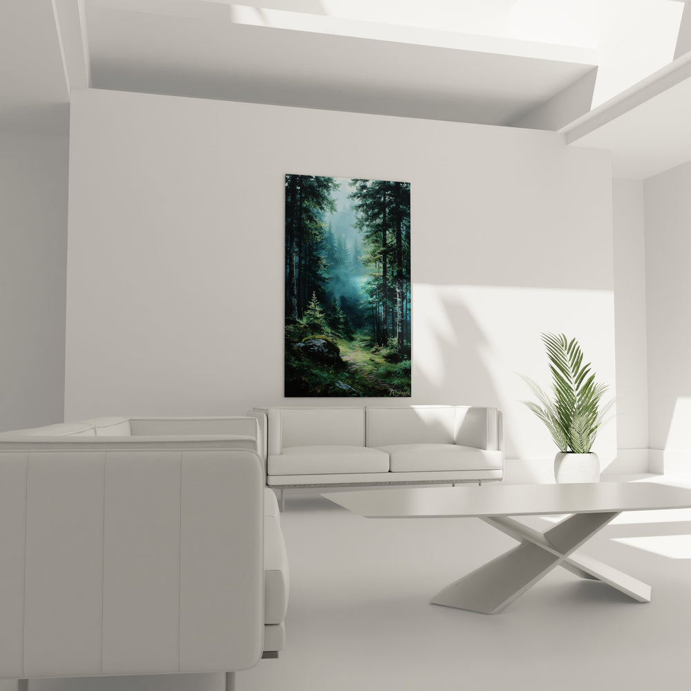 Tags : tableau forêt mystérieuse, décoration murale nature, peinture sentier forestier, art paysage sylvestre, tableau brume matinale