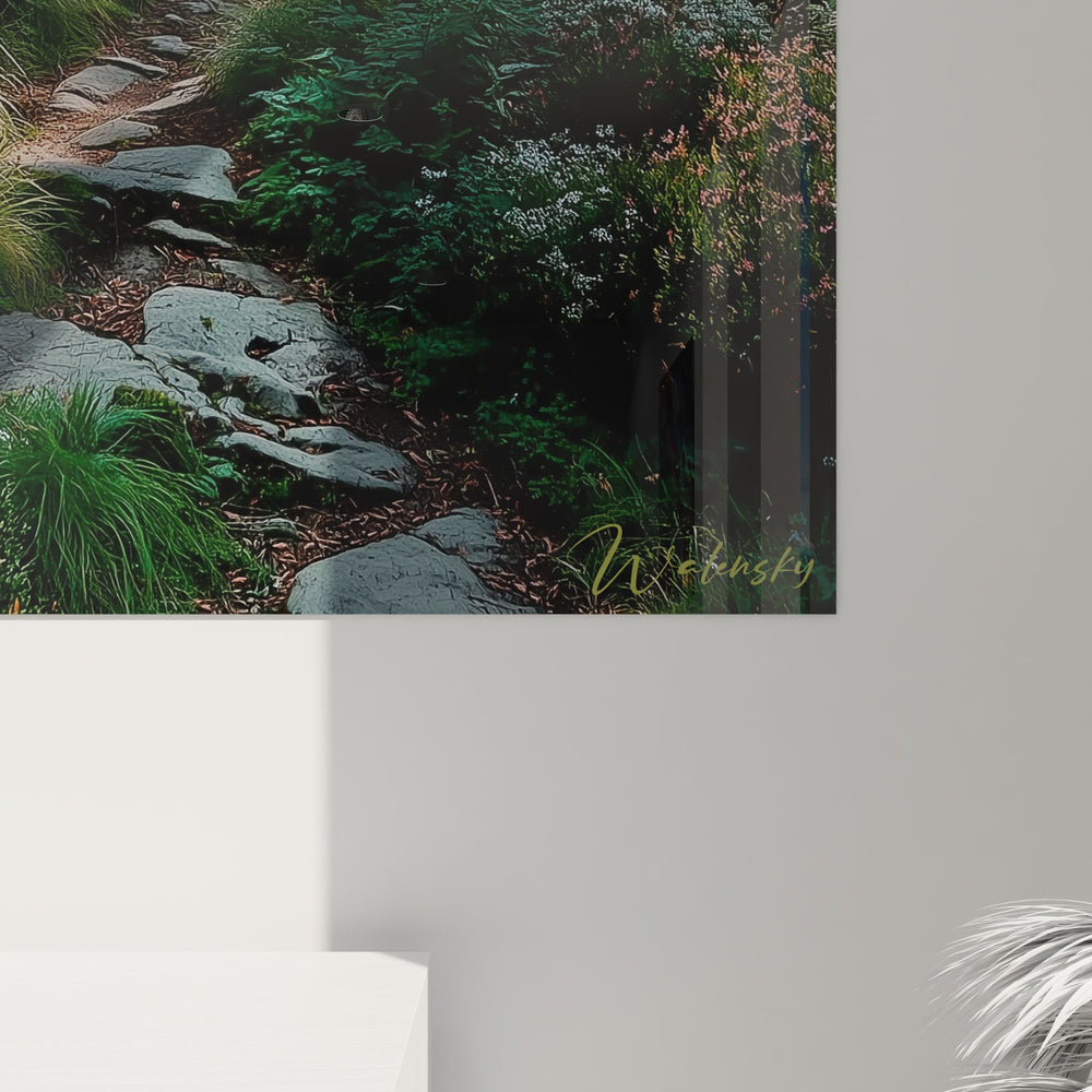 Ce tableau mural sentier forestier capture la magie d'une forêt de conifères traversée par un chemin de randonnée naturel. L'œuvre révèle un sentier sinueux serpentant entre des arbres centenaires aux troncs imposants, créant une perspective profonde qui invite à la contemplation. La lumière dorée matinale filtre délicatement à travers la canopée dense, illuminant les mousses verdoyantes qui recouvrent les rochers et le sol forestier. Les rayons lumineux créent des jeux d'ombres et de lumières spectaculaires, transformant cette scène de nature sauvage en véritable sanctuaire de paix. Ce tableau décoratif forêt présente une composition équilibrée où chaque élément naturel trouve sa place : les fougères luxuriantes, les pierres moussues, et la végétation dense créent une atmosphère d'harmonie parfaite. L'artiste a su capturer l'essence même de la forêt boréale mystique, offrant une fenêtre sur un monde préservé où le temps semble suspendu. Cette œuvre d'art nature transforme instantanément tout espace de vie en refuge apaisant.
