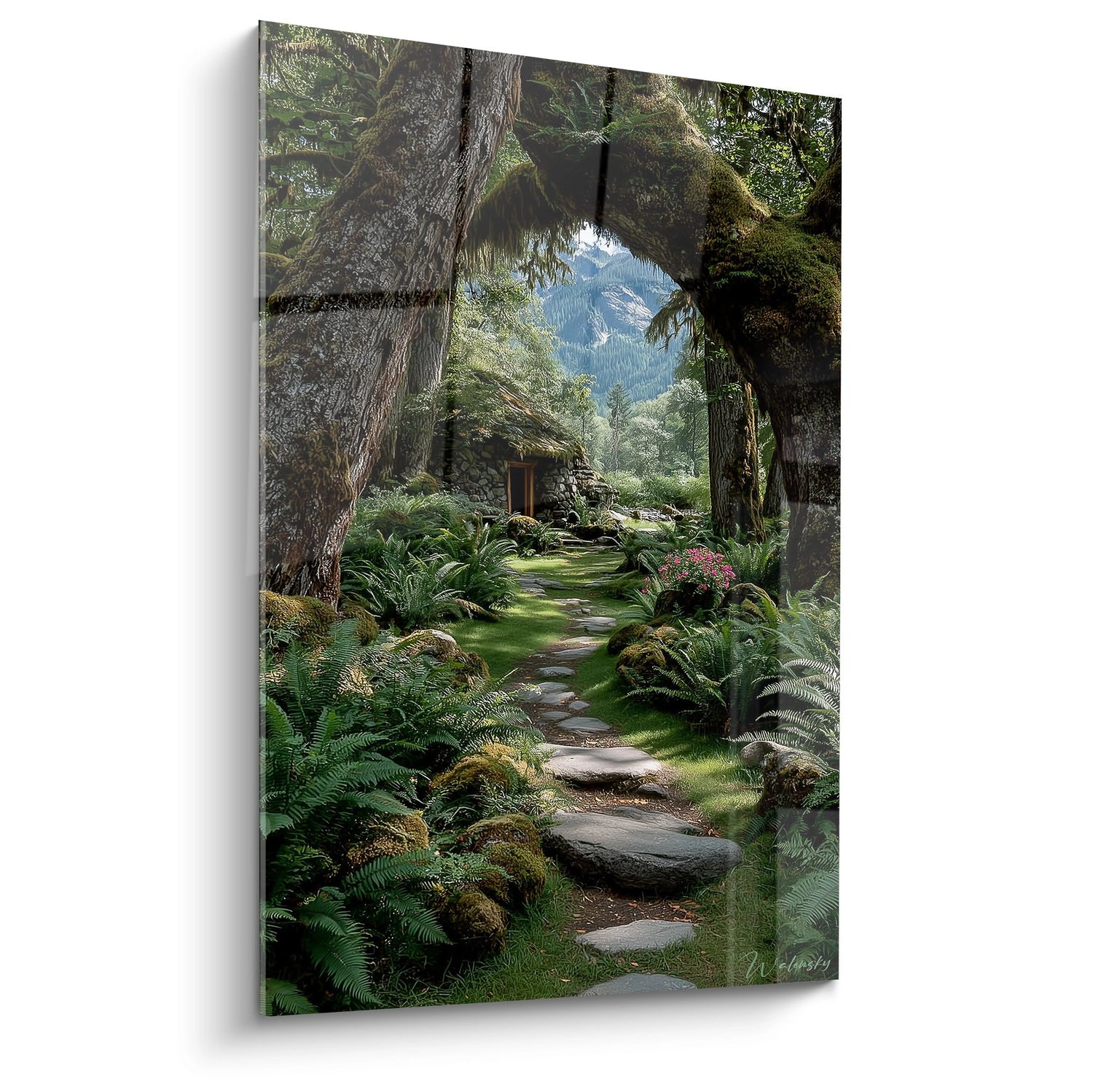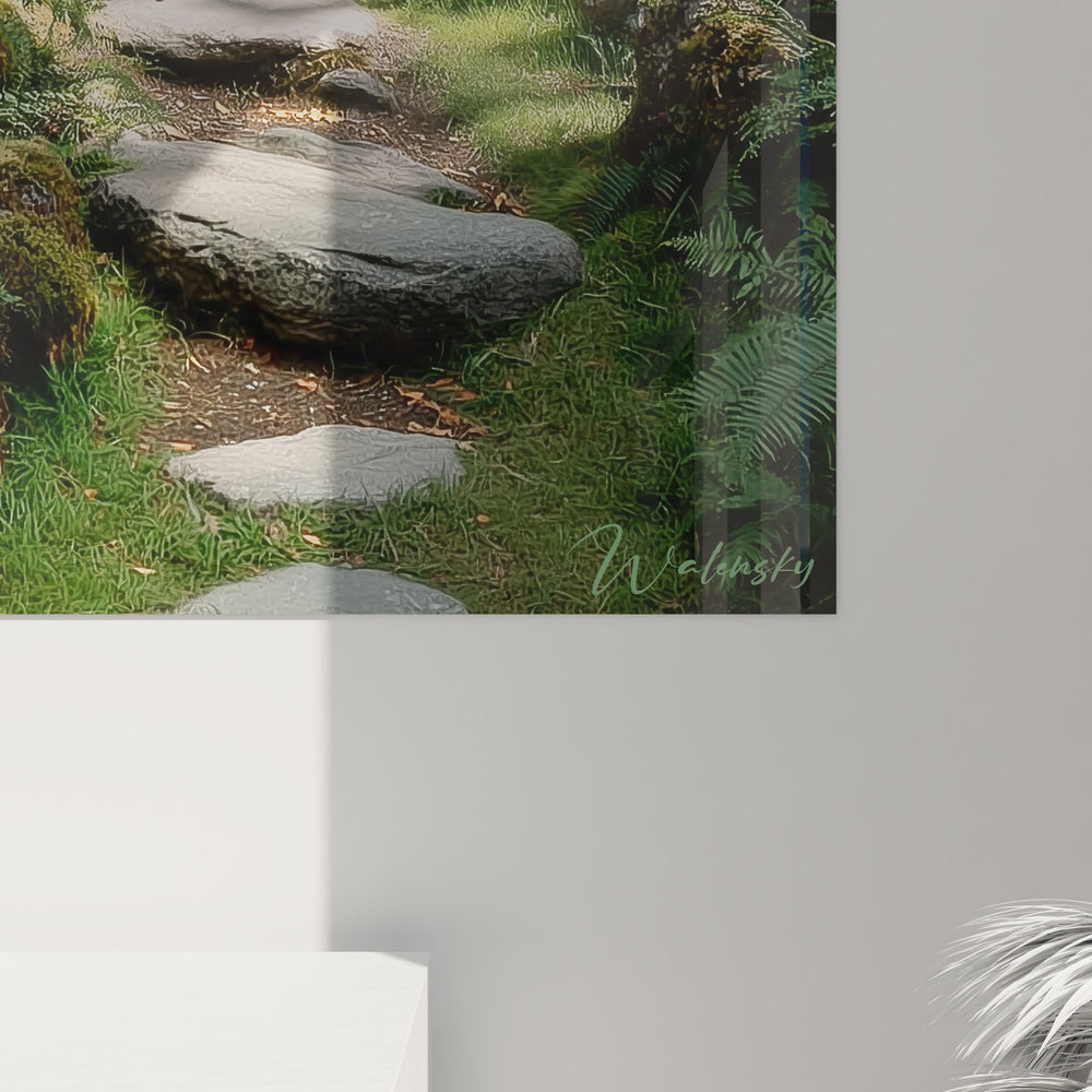Ce tableau mural forêt présente un sentier forestier enchanteur serpentant à travers une végétation luxuriante et mystérieuse. L'œuvre capture un moment magique où la nature révèle ses secrets les plus intimes à travers un passage naturel formé par d'imposants troncs d'arbres moussus. Le chemin de pierres naturelles guide le regard vers les montagnes brumeuses qui se dessinent à l'horizon, créant une profondeur saisissante. Les fougères géantes et la mousse verdoyante qui recouvrent généreusement les rochers et les arbres témoignent de l'humidité et de la richesse de cet écosystème forestier. Cette peinture de paysage naturel évoque parfaitement l'atmosphère contemplative d'une forêt primaire préservée. Les jeux d'ombre et de lumière filtrant à travers la canopée créent une ambiance féerique, tandis que les détails minutieux de la végétation révèlent la complexité de la biodiversité forestière. Ce tableau nature mystique transforme instantanément l'espace de vie en invitant à la méditation et à l'évasion spirituelle vers des contrées sauvages et préservées.