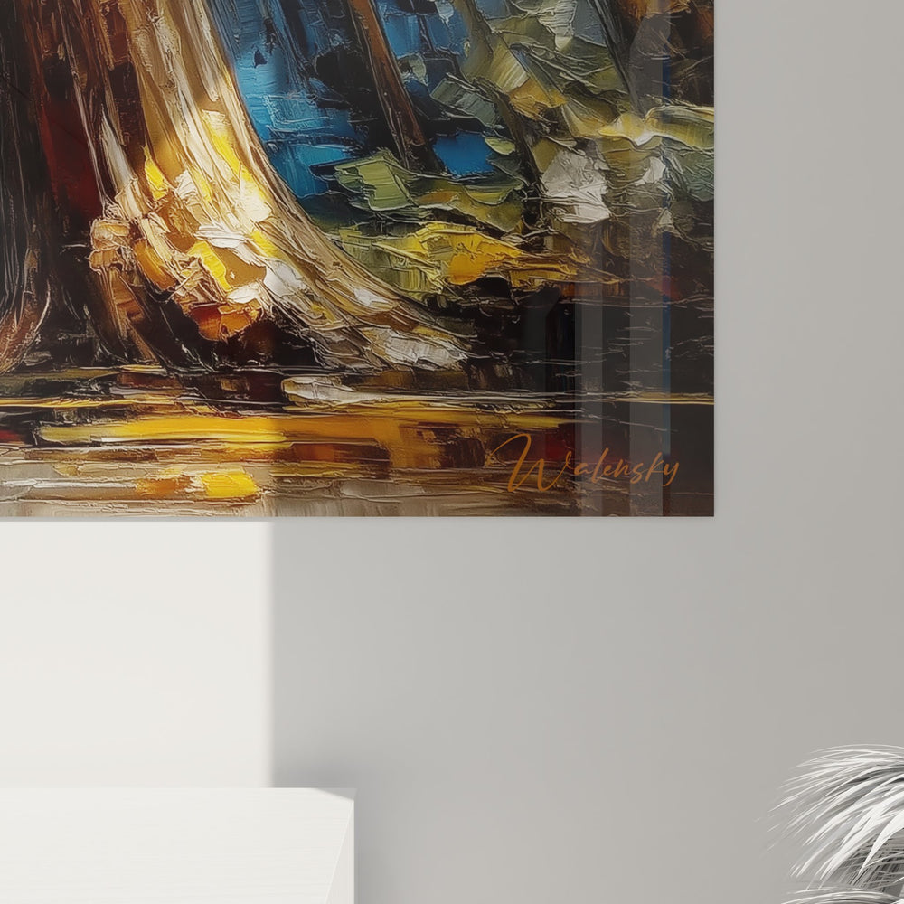 Ce tableau mural séquoias capture la grandeur exceptionnelle d'une forêt de géants millénaires dans une composition artistique saisissante. L'œuvre dépeint avec une technique de peinture à l'huile moderne l'intérieur d'une cathédrale naturelle formée par d'immenses troncs de séquoias s'élevant vers un ciel doré. Les arbres géants forestiers dominent la composition par leur prestance et leur verticalité imposante, créant un sentiment de vénération et d'humilité face à la nature. La technique picturale emploie des empâtements généreux qui donnent une texture riche et expressive à l'ensemble. Les couleurs chaudes dorées de la canopée contrastent harmonieusement avec les tons bleus mystérieux qui filtrent entre les troncs, créant une atmosphère presque spirituelle. Ce tableau forêt majestueuse transforme l'espace en invitant le regard vers les hauteurs, évoquant la sensation d'être au cœur d'un sanctuaire naturel préservé. Les jeux de lumière suggèrent les rayons du soleil perçant à travers le feuillage dense, illuminant cette décoration murale nature d'une aura presque divine. L'artiste a su rendre la texture rugueuse de l'écorce et la profondeur mystérieuse de cette forêt primordiale.
