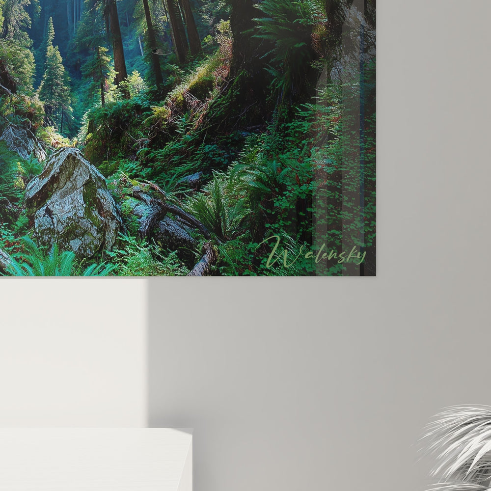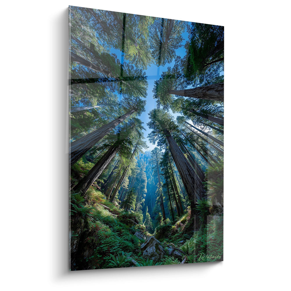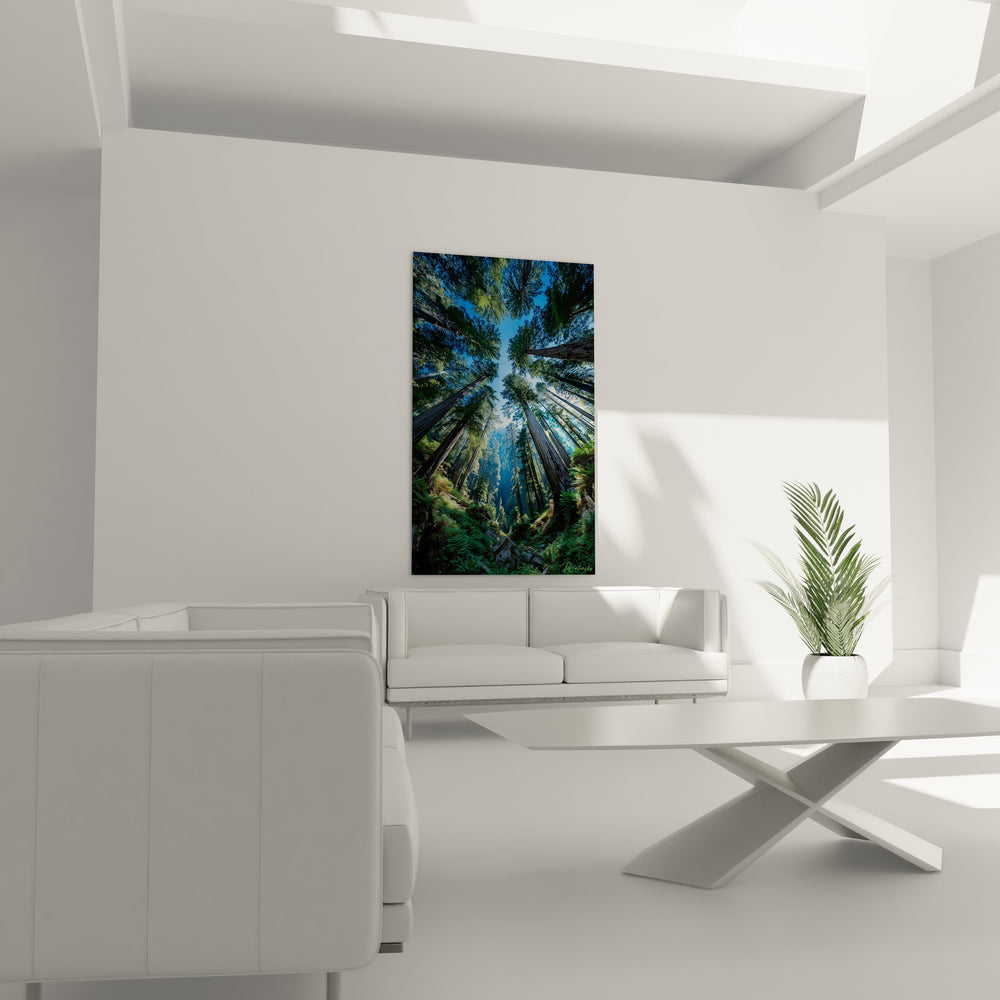 La palette chromatique de ce tableau décoratif forêt s'articule autour des verts profonds du feuillage et des bruns chauds des troncs. Le bleu azur du ciel, visible à travers la canopée, apporte une dimension spirituelle à l'ensemble. Cette décoration nature séquoias symbolise la force, la longévité et la connexion entre la terre et le ciel, évoquant un sentiment de paix intérieure et de grandeur naturelle.