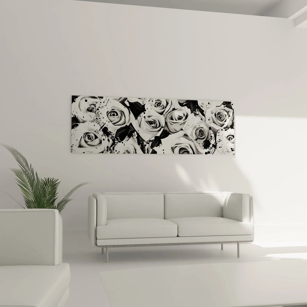 La palette chromatique restreinte révèle toute la richesse expressive du noir et blanc. Les nuances de gris s'étendent du blanc pur au noir profond, créant une gamme tonale d'une sophistication remarquable. Cette art mural roses noir et blanc exploite magistralement les contrastes pour sculpter chaque forme florale.