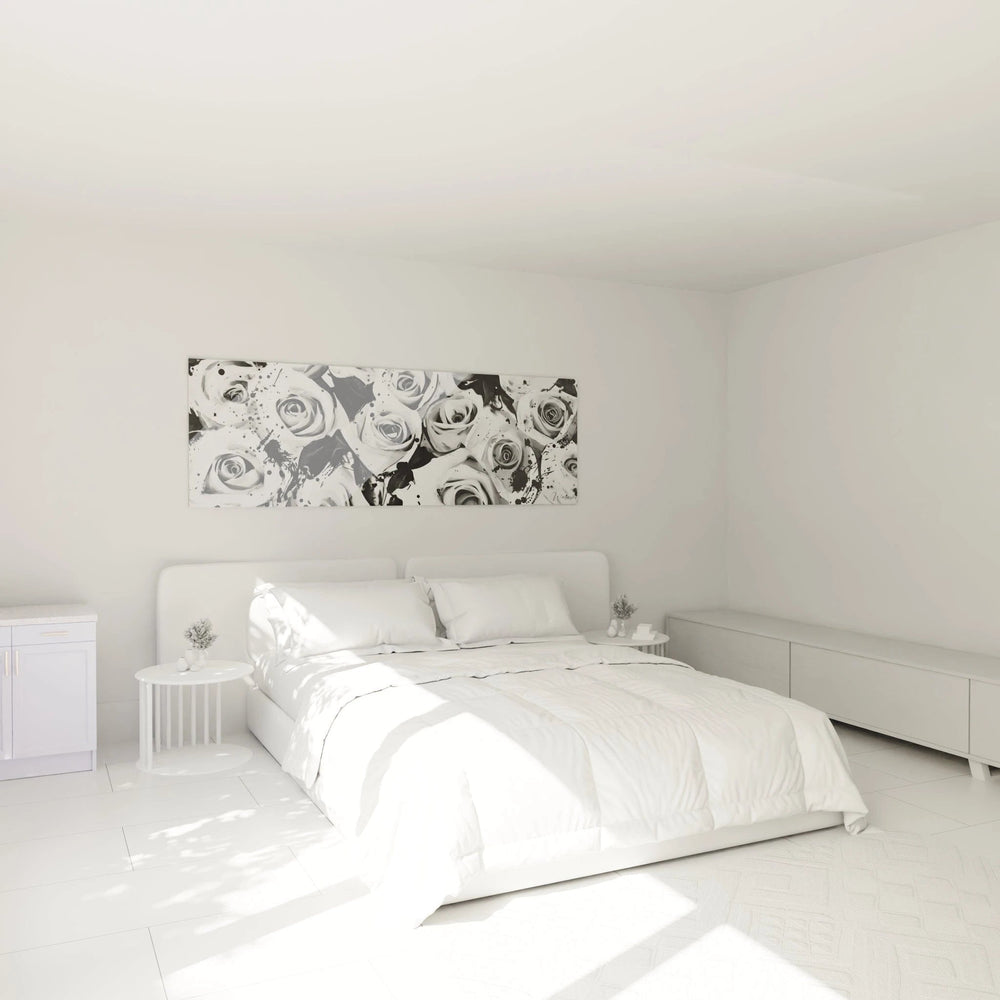 Cette œuvre trouve sa place idéale dans des espaces contemporains où elle peut deployer toute sa dimension horizontale. Un éclairage LED doux et uniforme révèle parfaitement les nuances subtiles sans créer de reflets parasites. Les intérieurs aux tons neutres - blancs, gris, beiges - forment un écrin parfait qui ne concurrence pas l'intensité de l'œuvre. Cette décoration murale roses moderne s'intègre harmonieusement dans un salon, une chambre ou un bureau professionnel. L'absence de couleur permet une adaptation facile à différents styles décoratifs, du minimaliste au classique contemporain. La dimension panoramique nécessite un mur suffisamment large pour respecter les proportions et permettre une contemplation optimale à distance convenable.