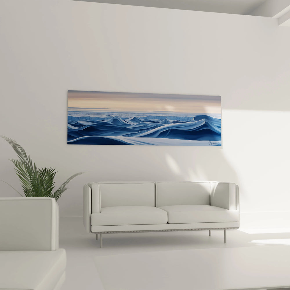 Né d’un voyage authentique dans l’Arctique, ce tableau immisce dans votre espace l’essence même des contrées glacées. Vous y découvrez des crêtes sculptées par le vent, des ondulations de glace qui capturent la lumière d’une manière presque magique. Ce terrain figé, pourtant fluide dans ses formes, crée un dialogue entre la solidité du présent et la mouvance du temps suspendu.