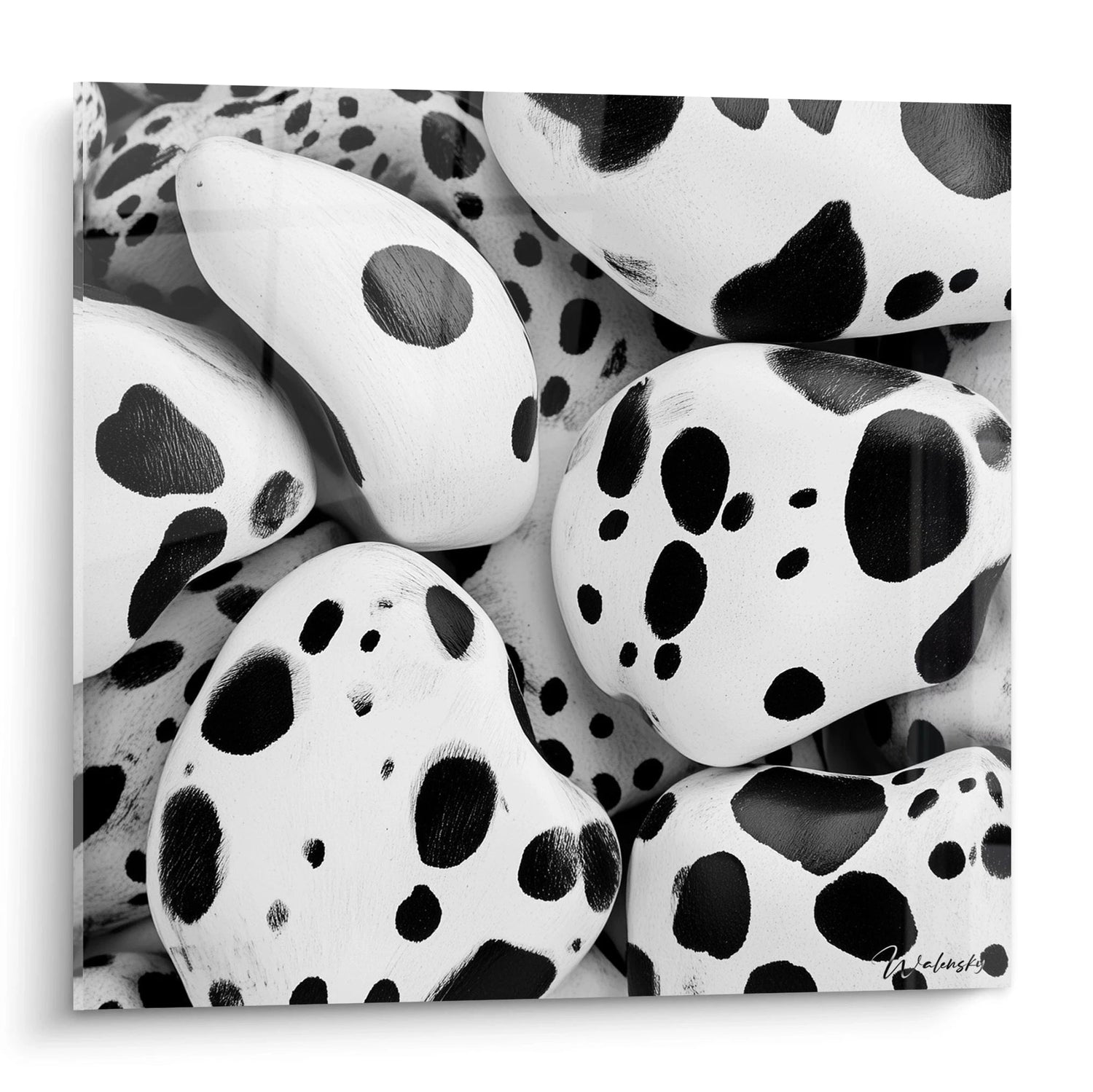 Ce tableau galets présente une composition saisissante de formes organiques aux motifs tachetés noir et blanc. L'œuvre révèle une collection de galets stylisés disposés harmonieusement, chacun orné de taches organiques qui évoquent les motifs naturels des pierres polies par les éléments. Le tableau galets tachetés noir et blanc capture l'essence minérale dans une esthétique épurée. Les formes arrondies et douces contrastent avec la géométrie des taches, créant un équilibre visuel captivant. Cette décoration murale galets moderne transforme des éléments naturels en art contemporain sophistiqué.