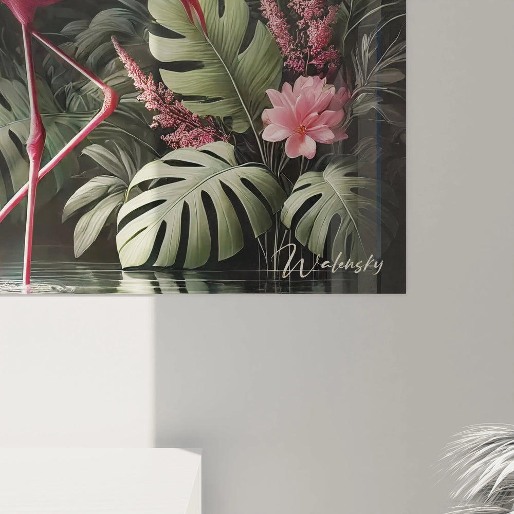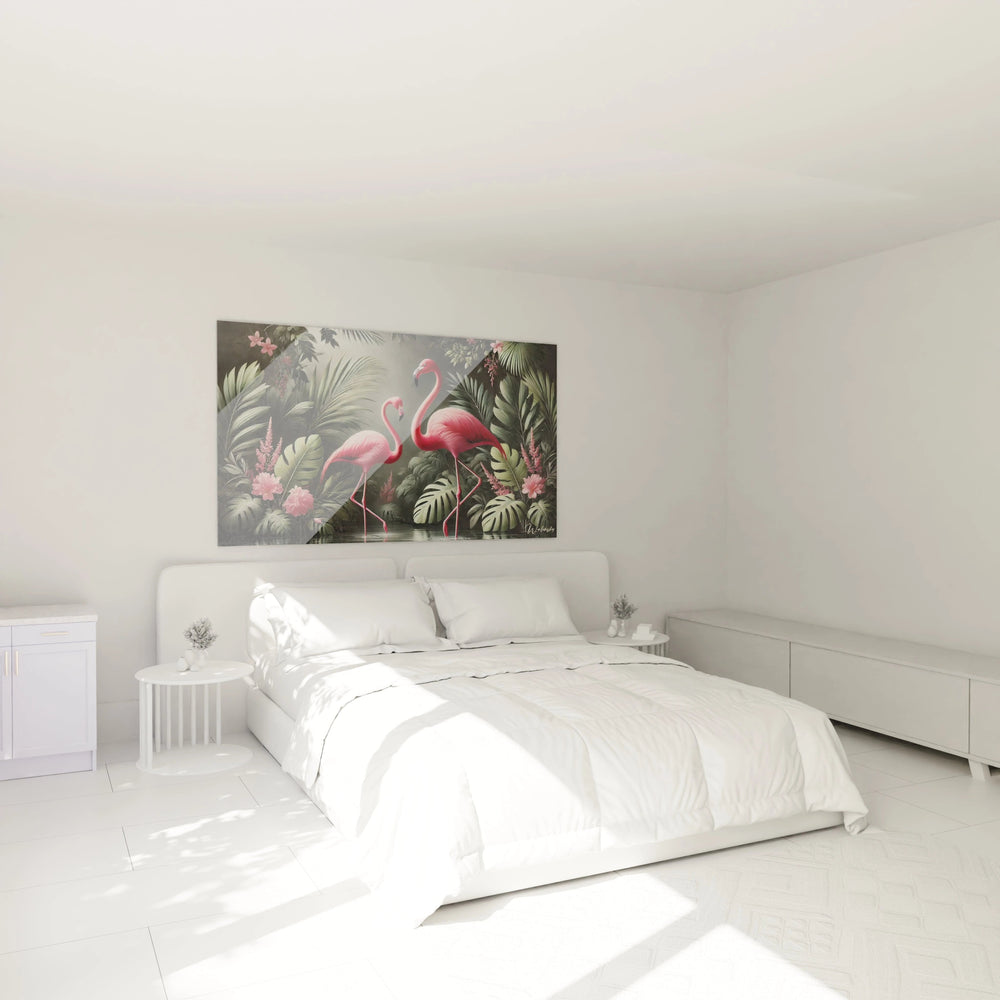 Ce tableau offre une harmonie visuelle captivante, où le contraste subtil entre les couleurs vives et les nuances profondes crée une atmosphère unique, propice à la détente. Les flamants roses, symboles de grâce et de légèreté, semblent se mouvoir avec douceur au sein d’un cadre végétal riche et vibrant. En accueillant cette pièce chez vous, vous invitez une présence apaisante et inspirante qui révèlera le charme de votre intérieur.